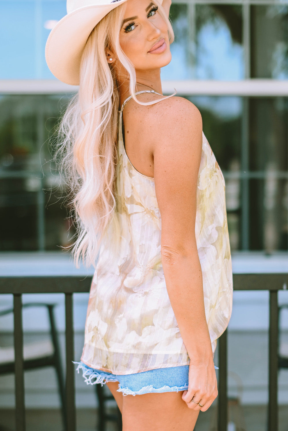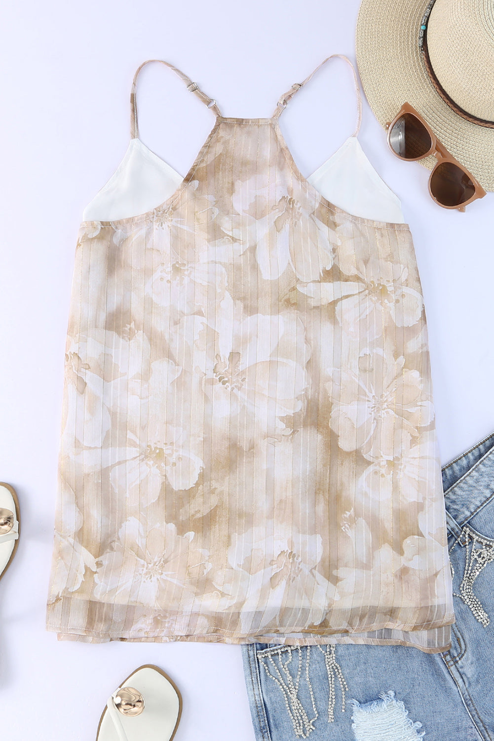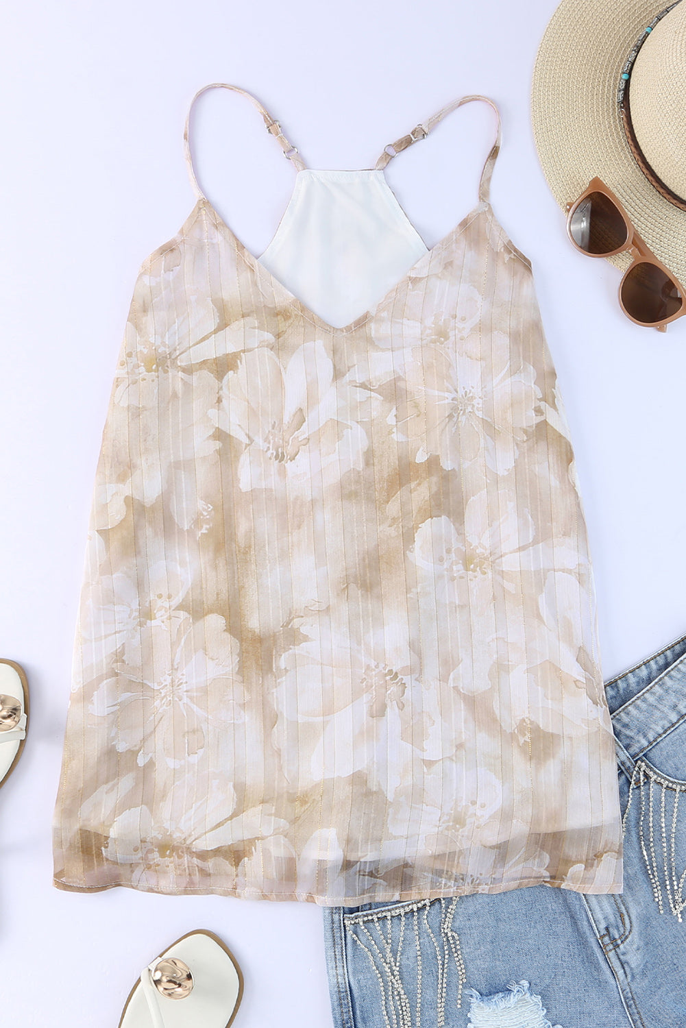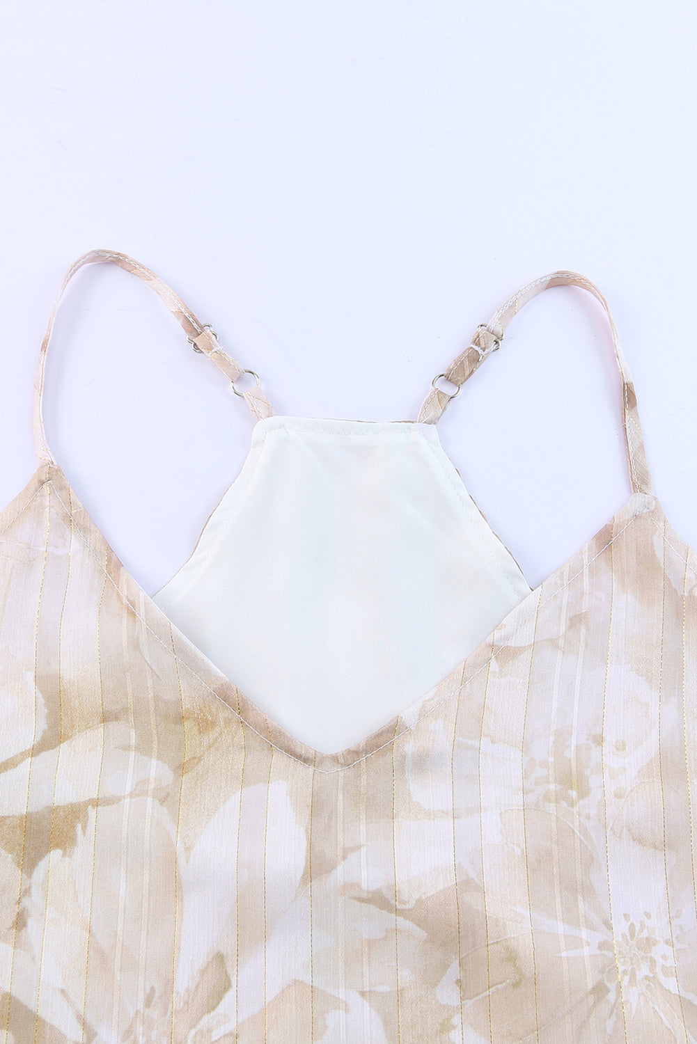 Apricot Floral Print Adjustable Spaghetti Strap V Neck Tank Top