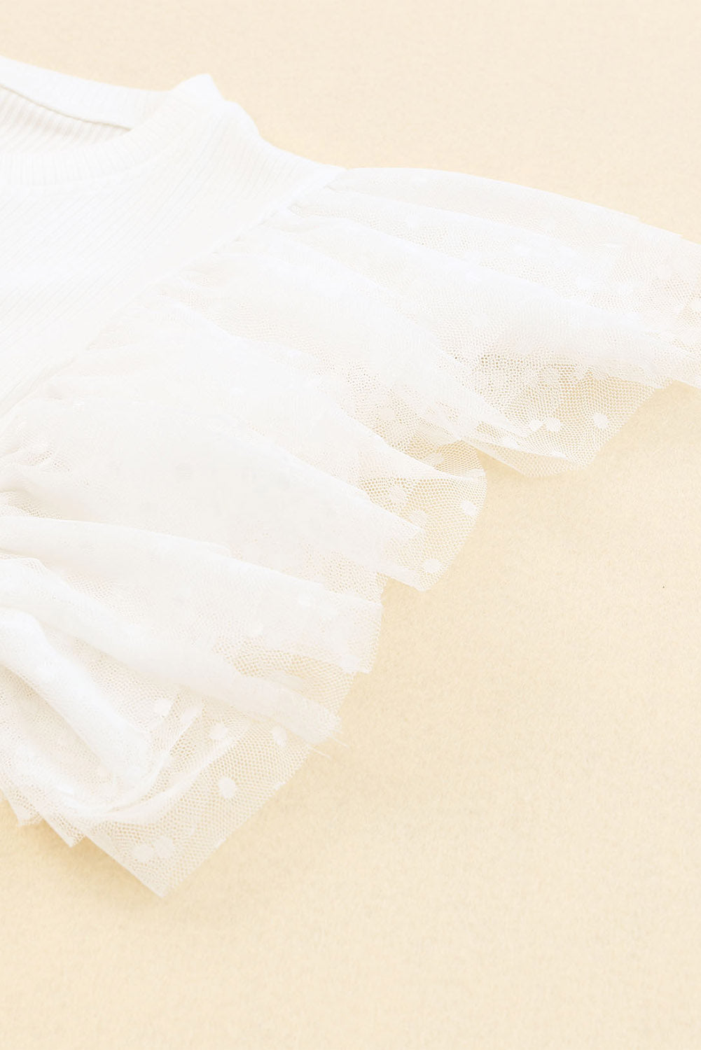 - It includes a crew neckline, mesh sleeves, ribbed fabric, and solid color