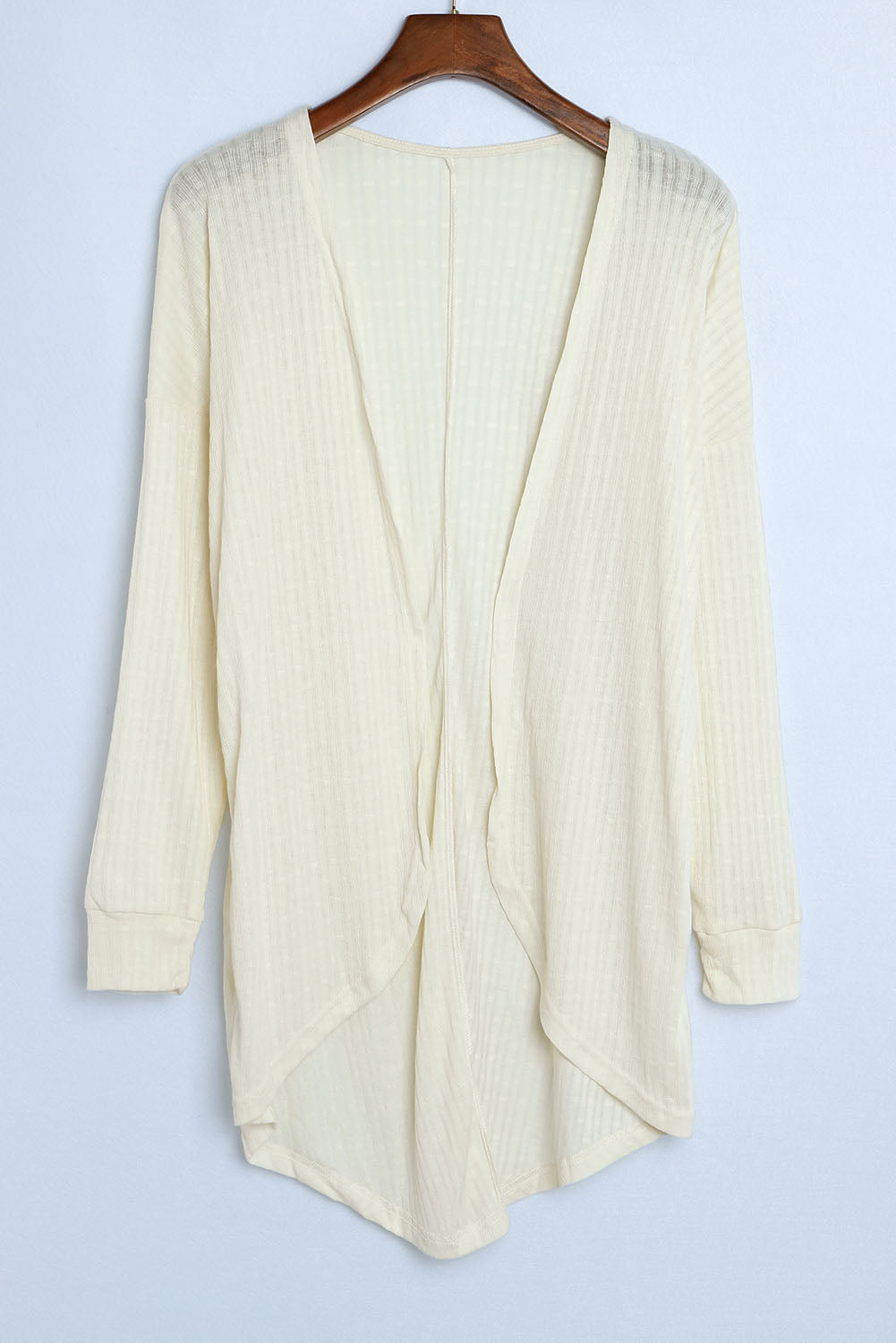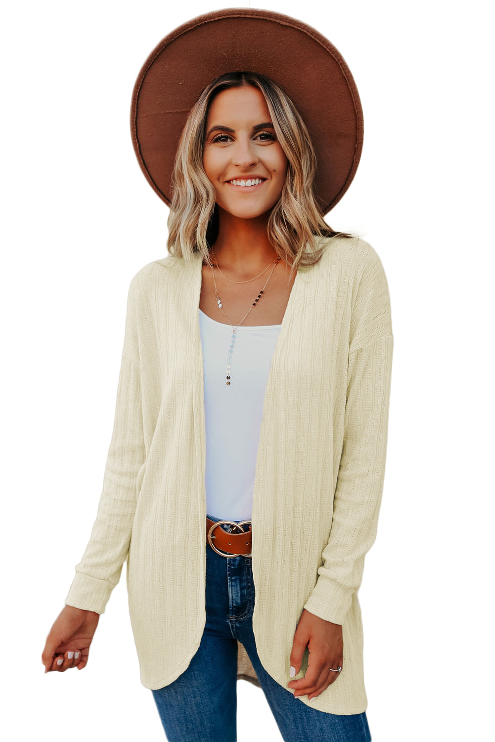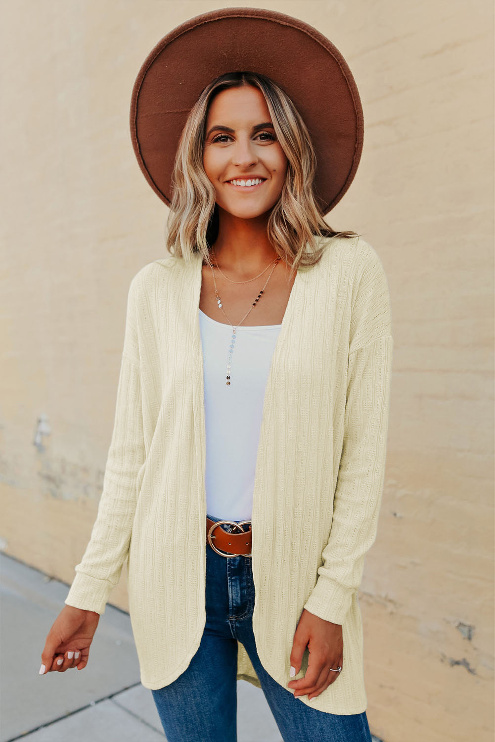 Beige Open Front Rounded Hem Textured Knit Cardigan
