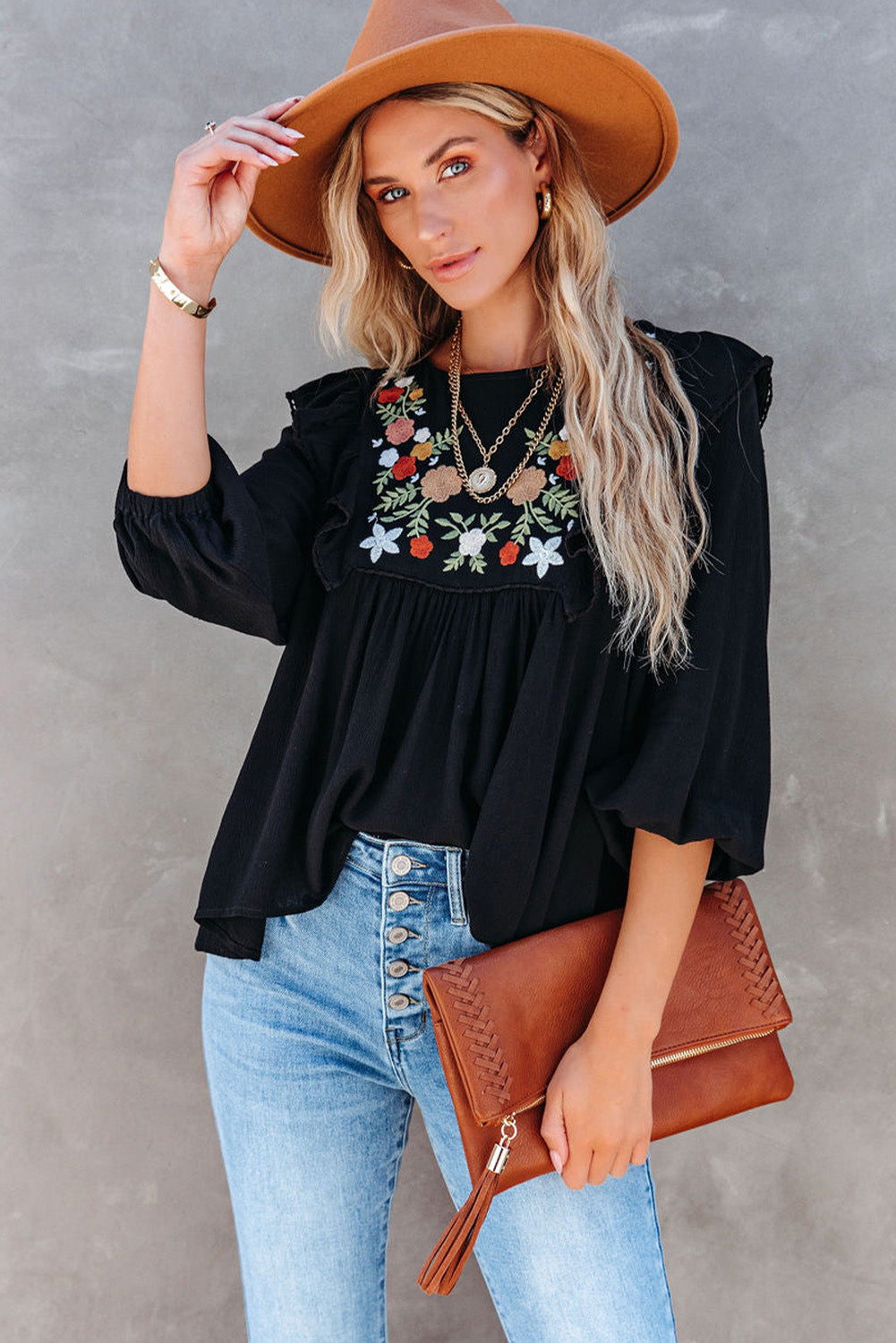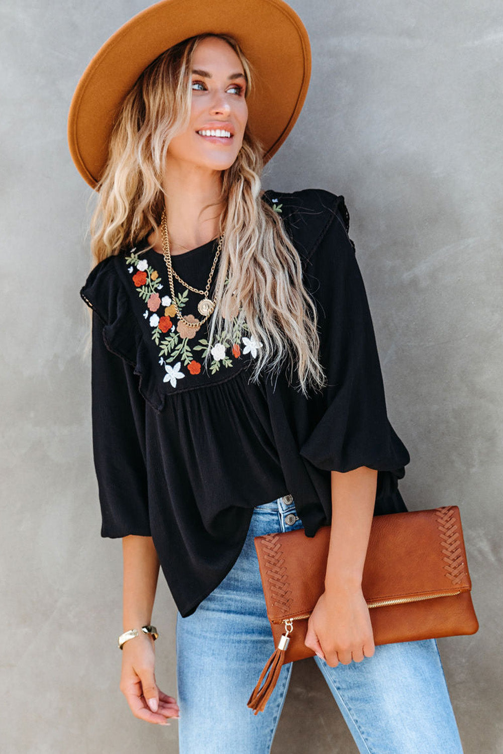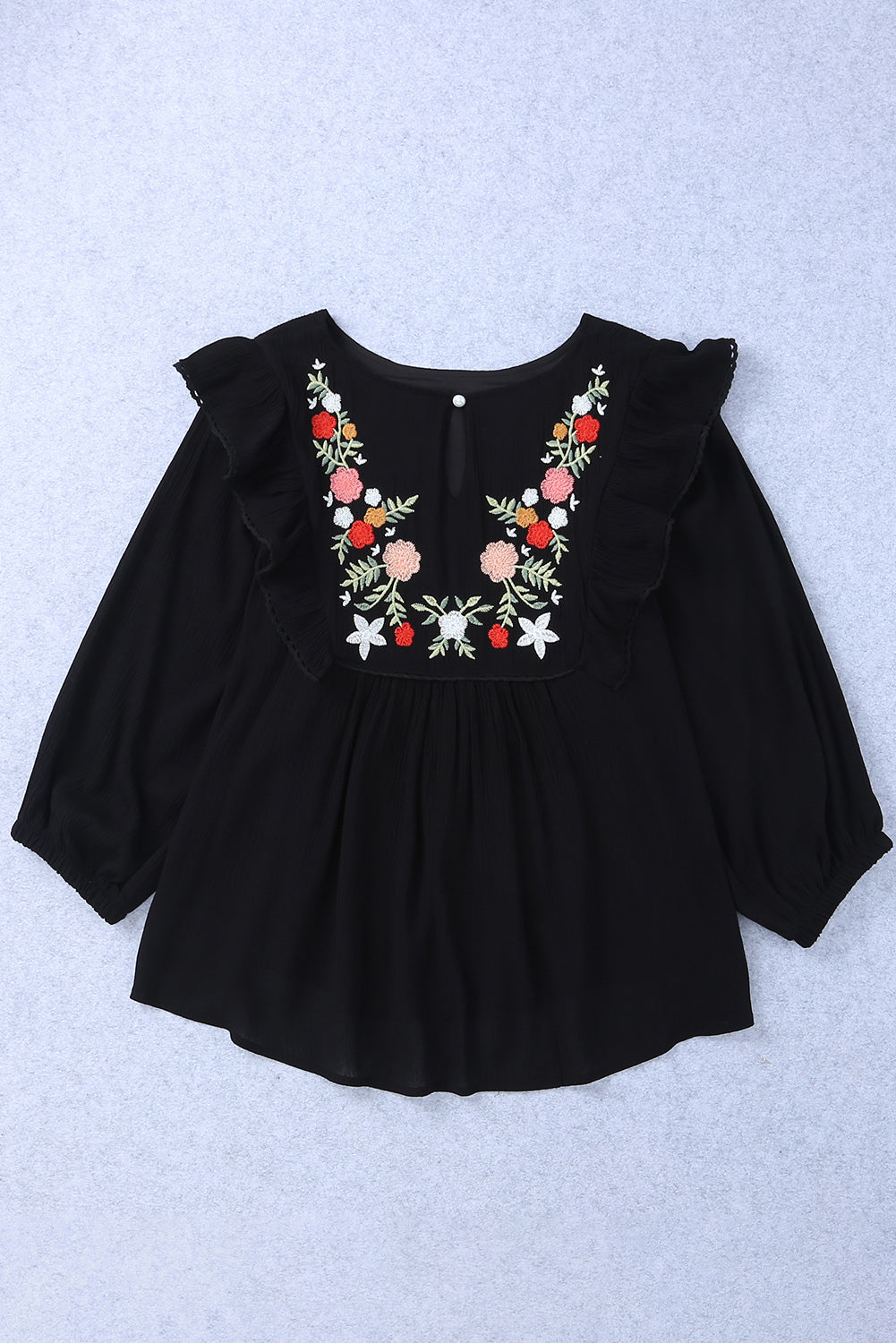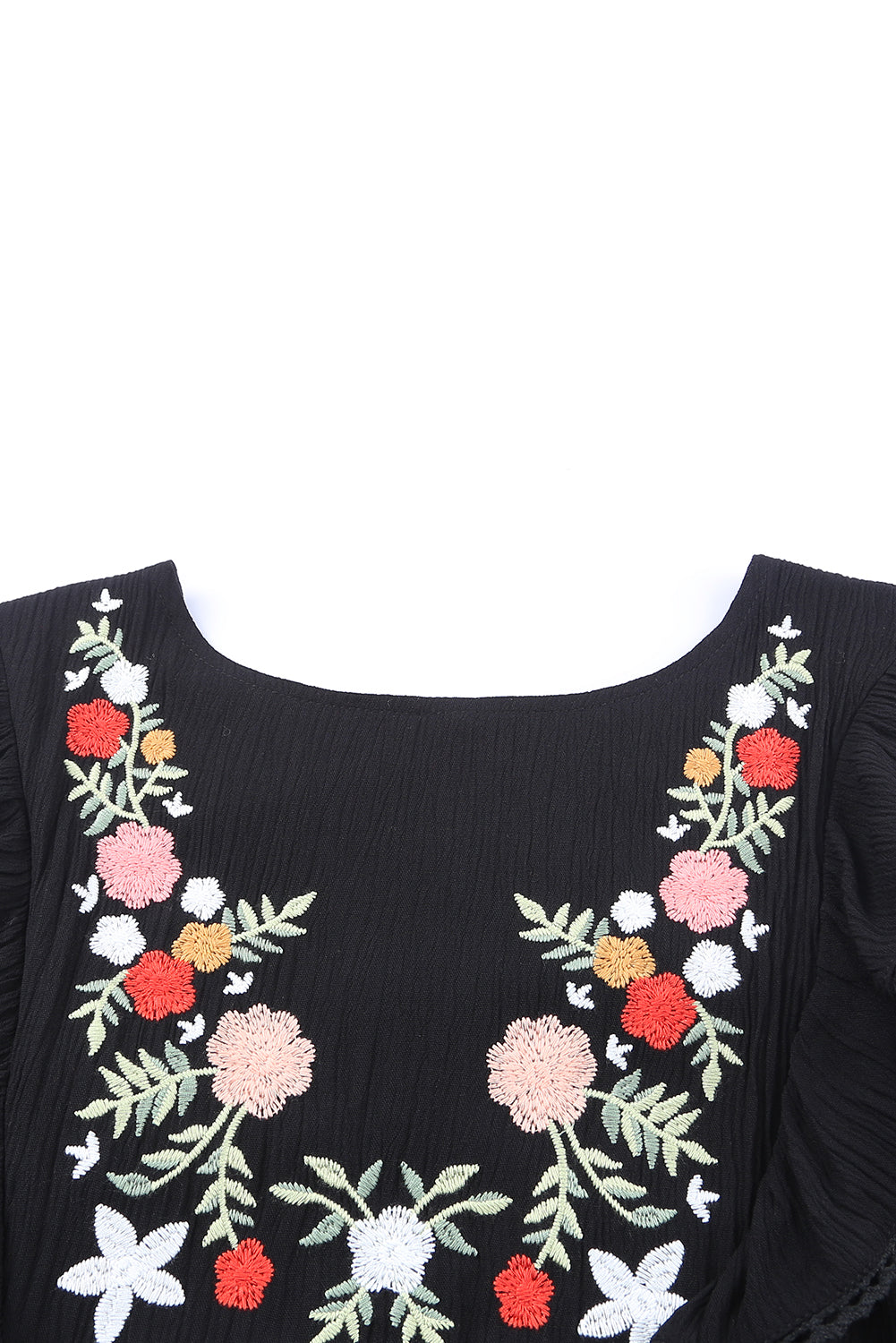 Black Bohemian Floral Embroidered Ruffled Babydoll Top