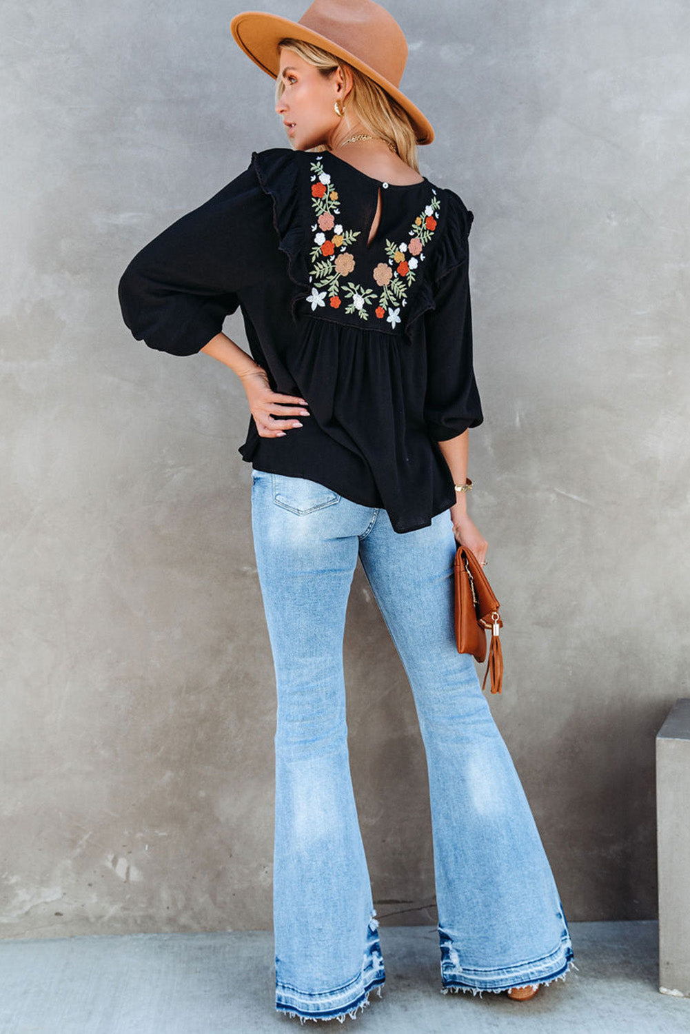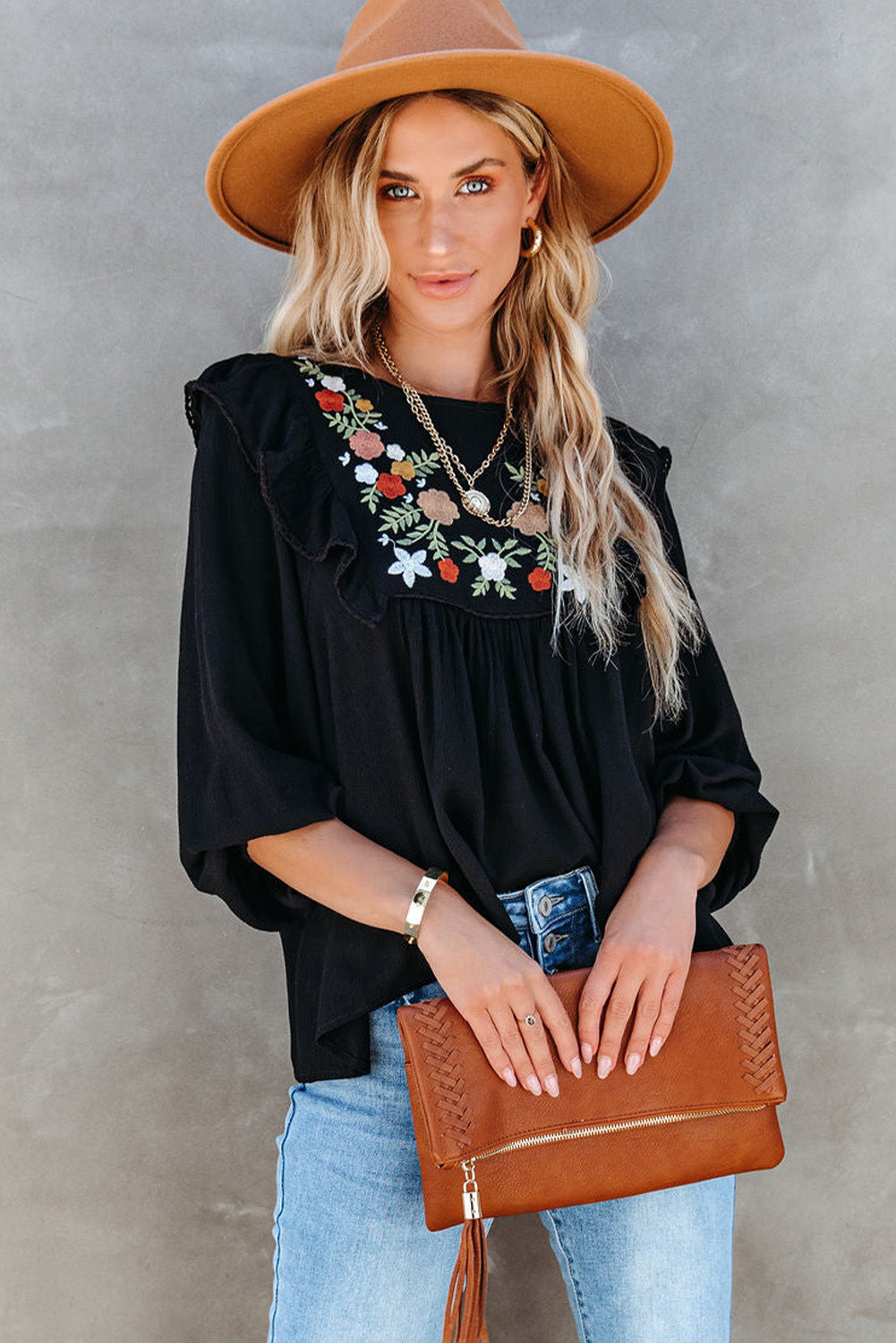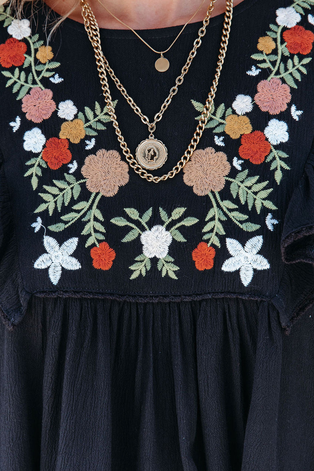 Black Bohemian Floral Embroidered Ruffled Babydoll Top