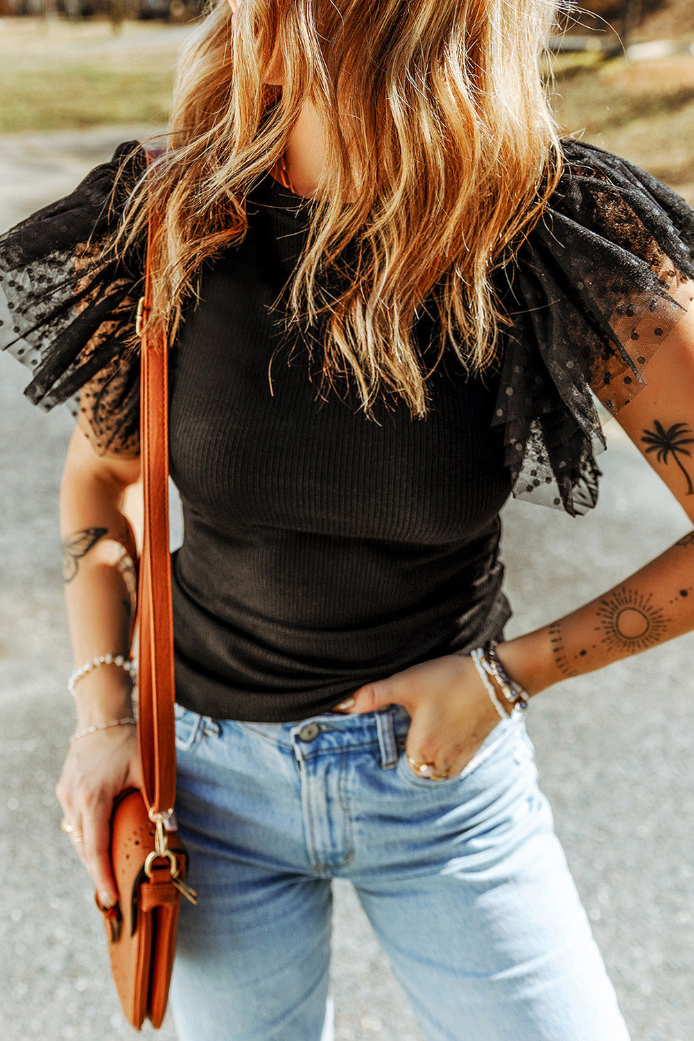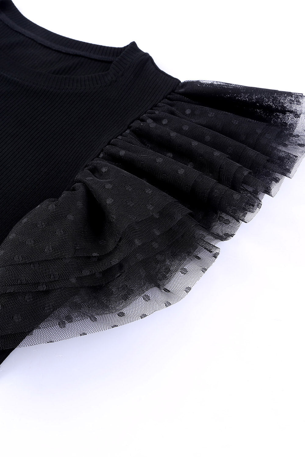 - It includes a crew neckline, mesh sleeves, ribbed fabric, and solid color