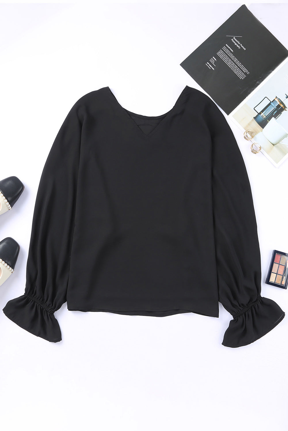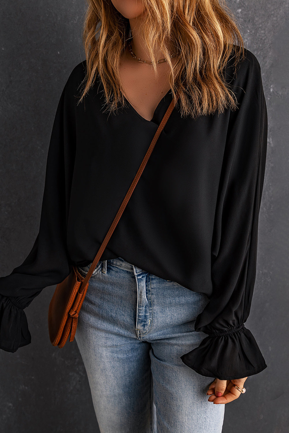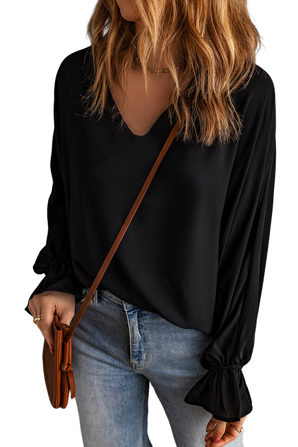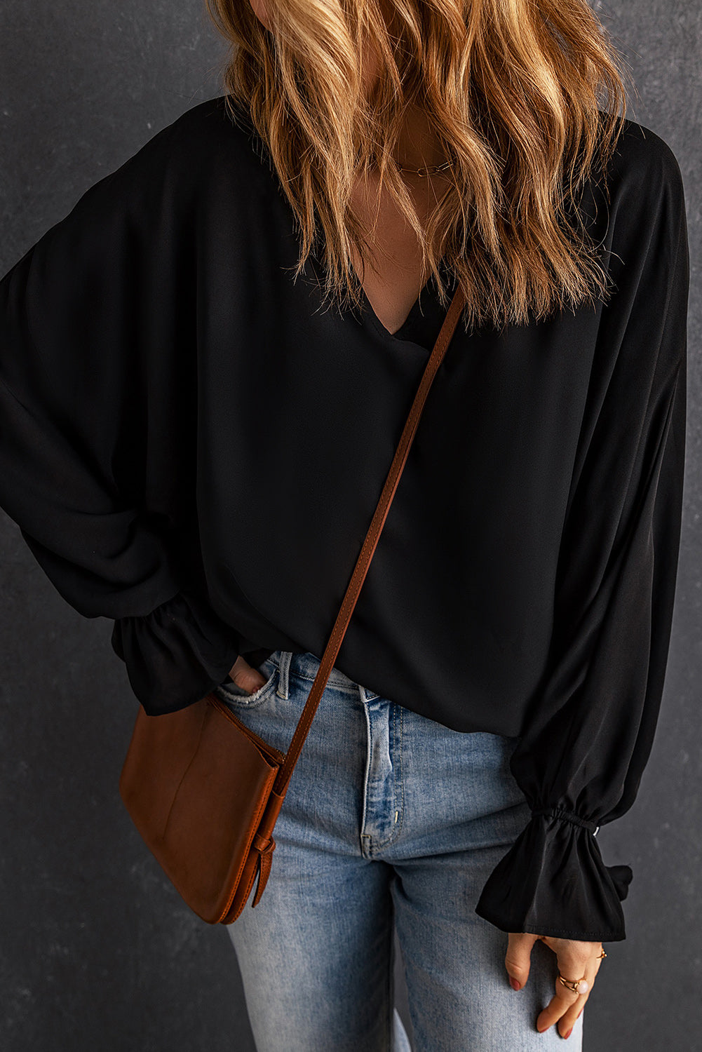 - This blouse is very elegant with a v neckline and flared cuff bishop sleeves