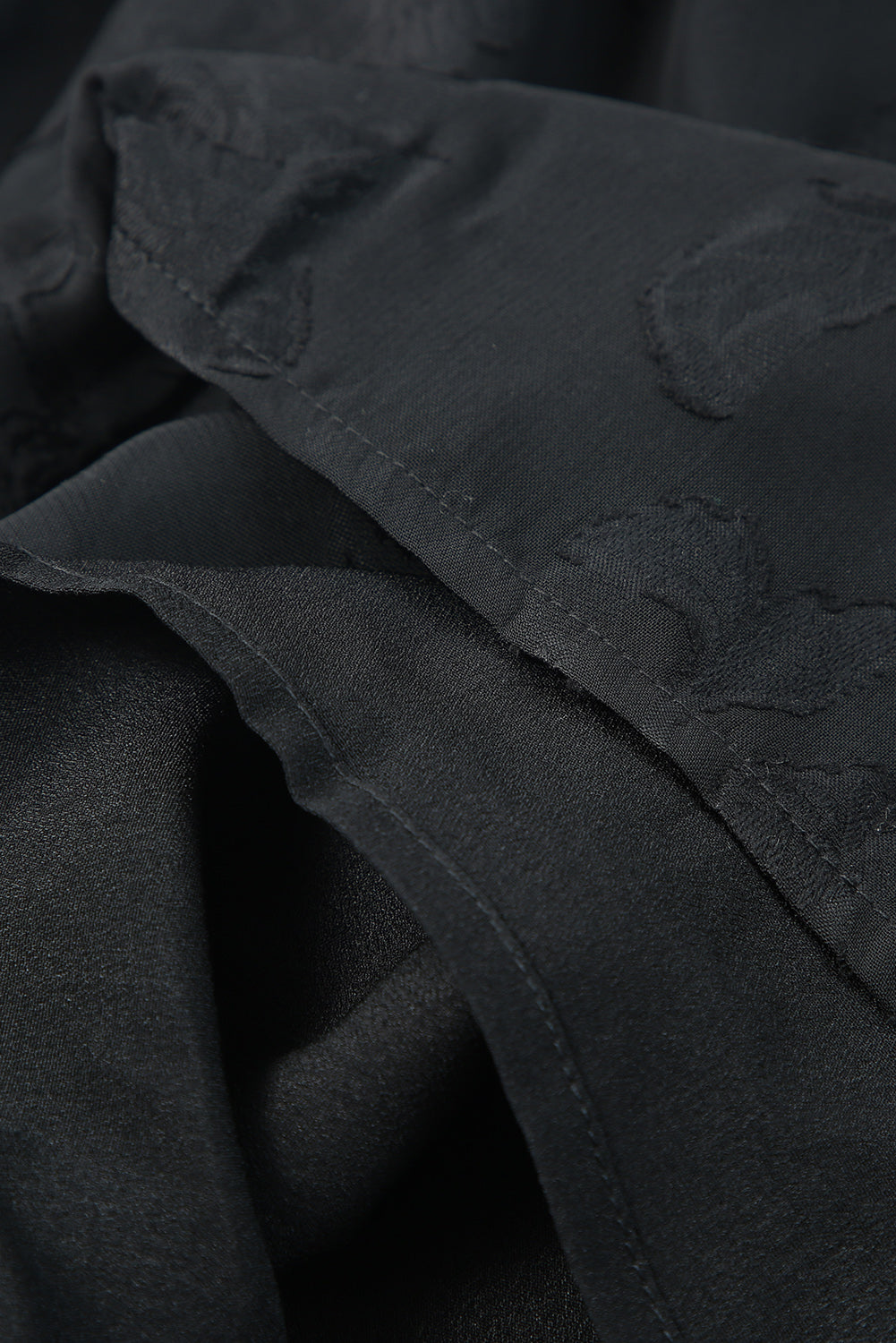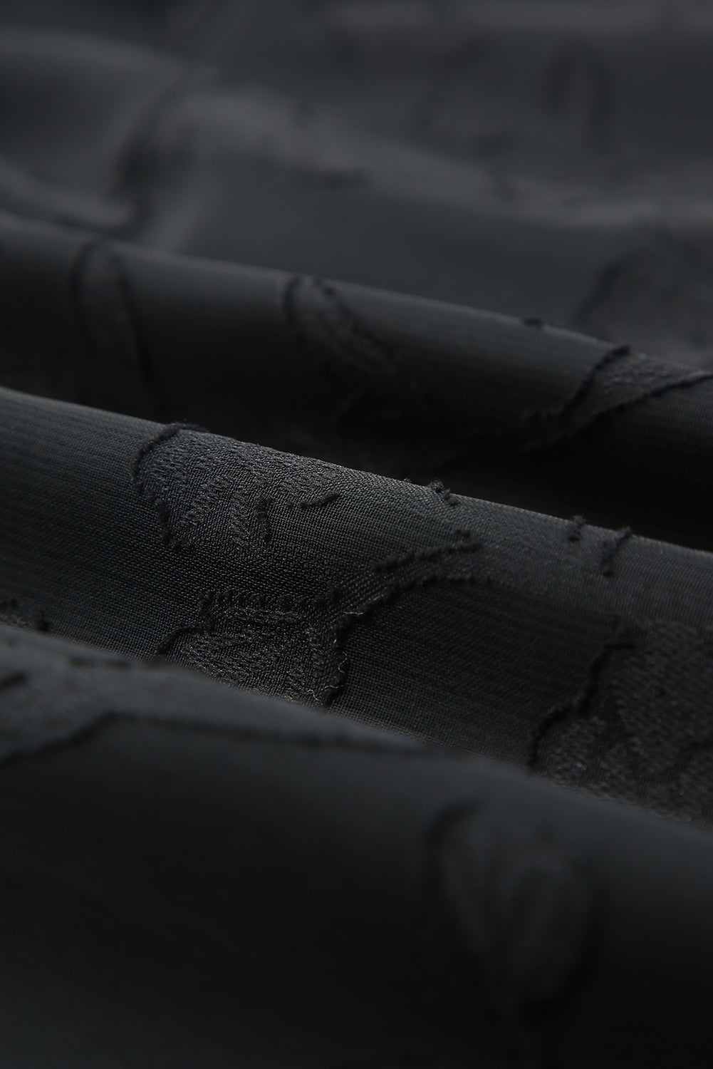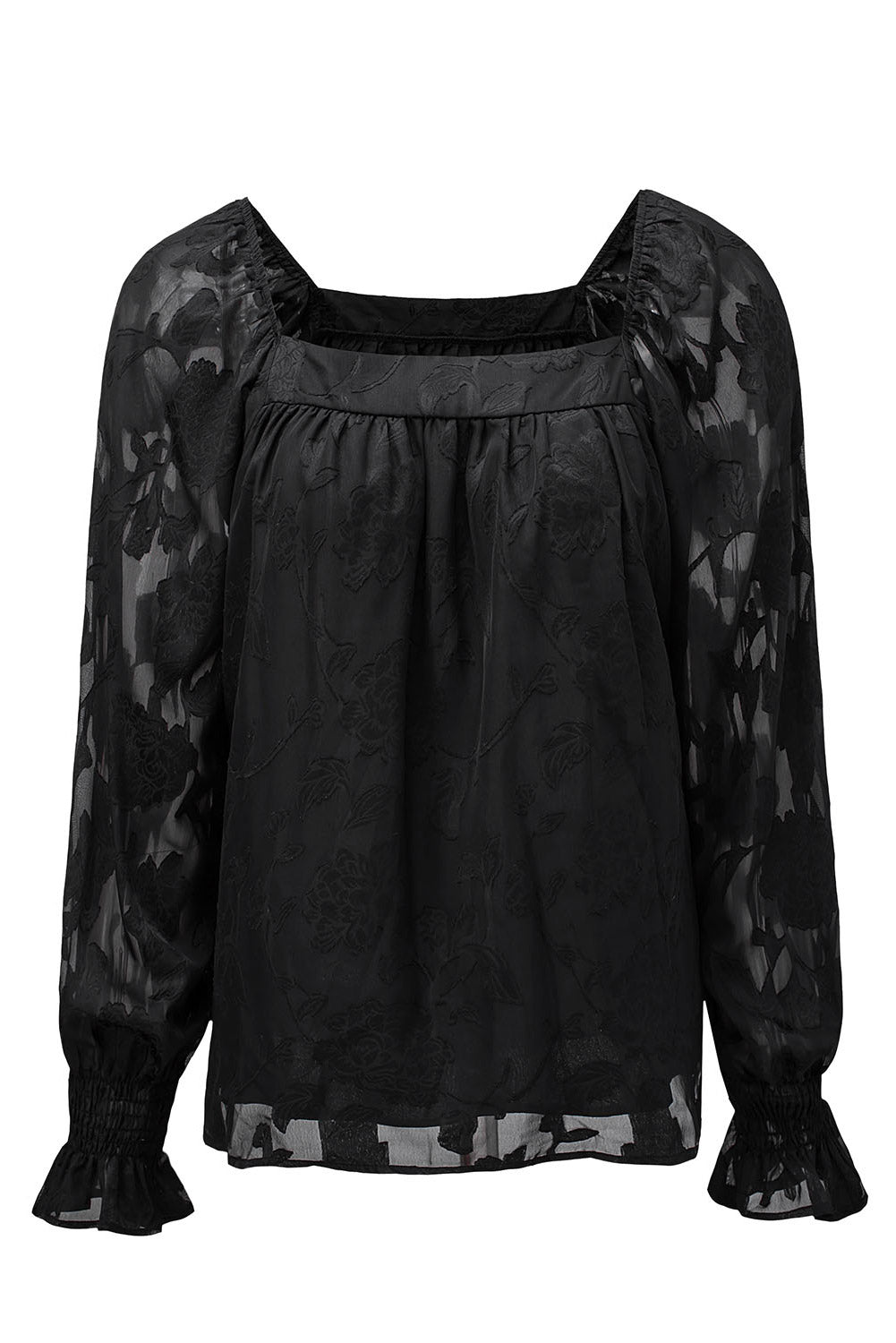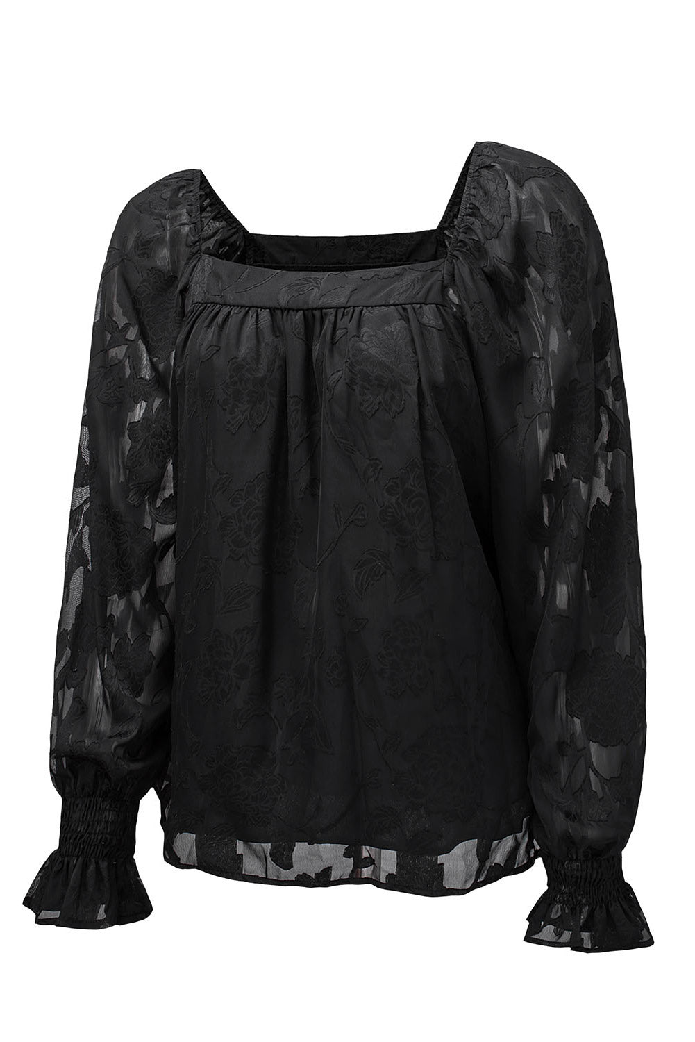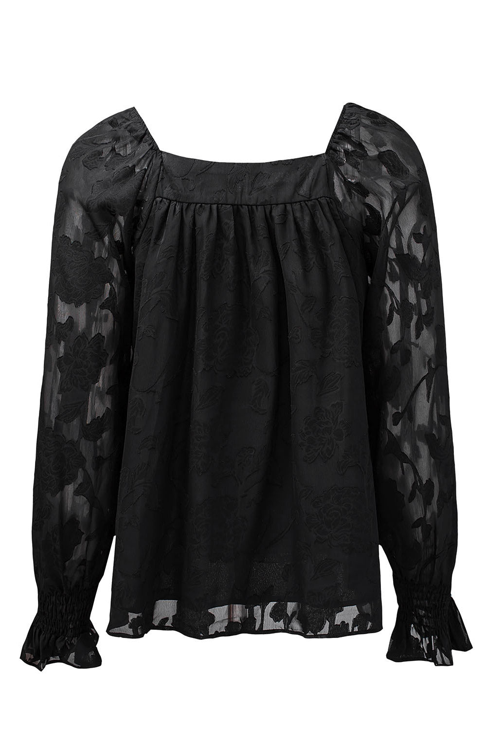 - It features a square neckline, bubble sleeves with ruffled cuffs