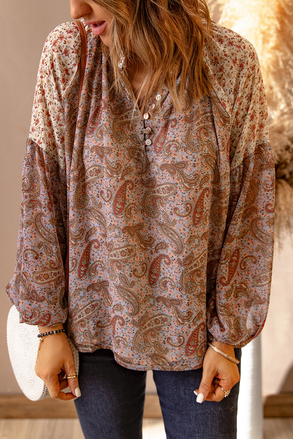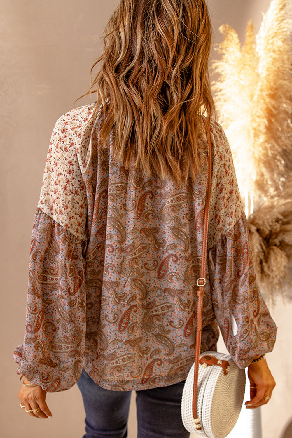 Brown Paisley Pattern Floral Patch Long Sleeve Blouse