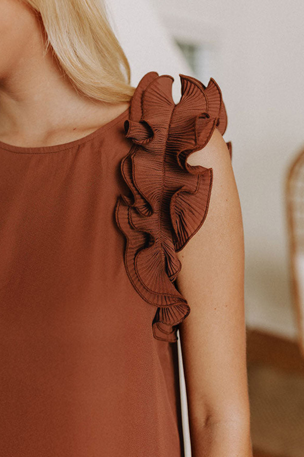 - Lightweight material, a rounded neckline, ruffled cap sleeves, a keyhole accented upper back with a button closure