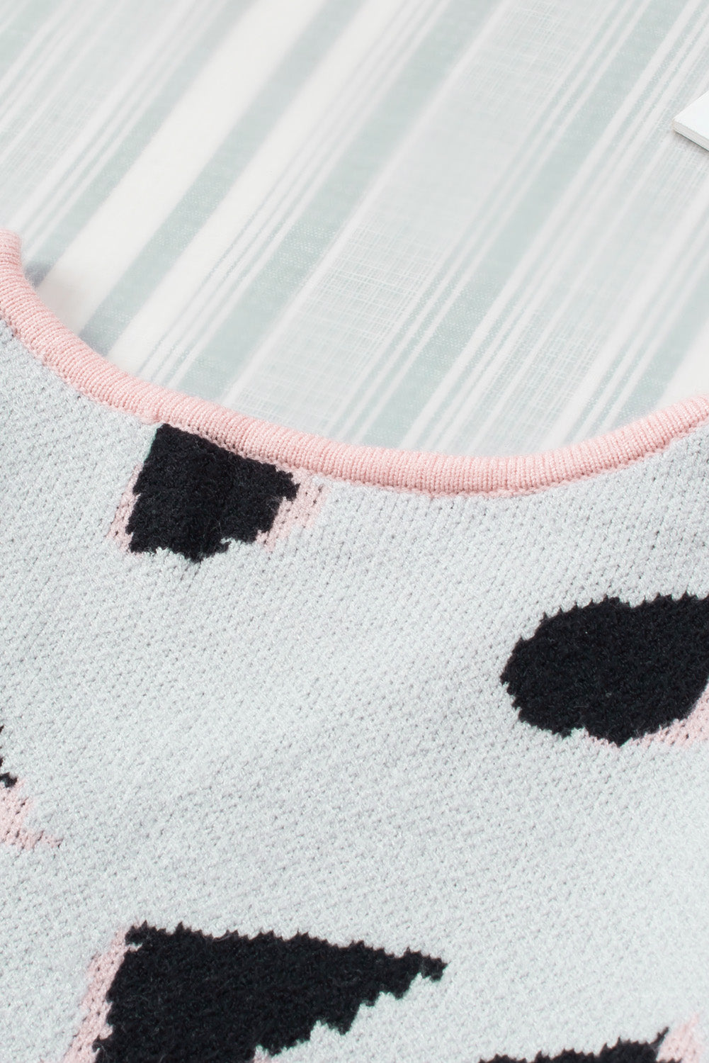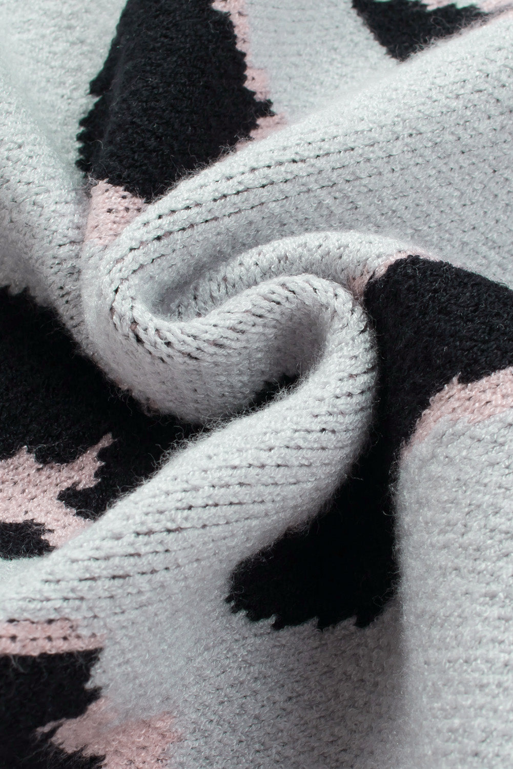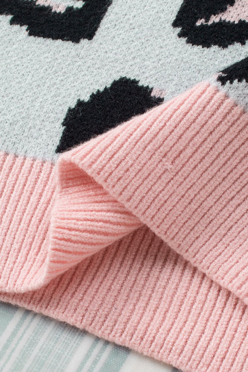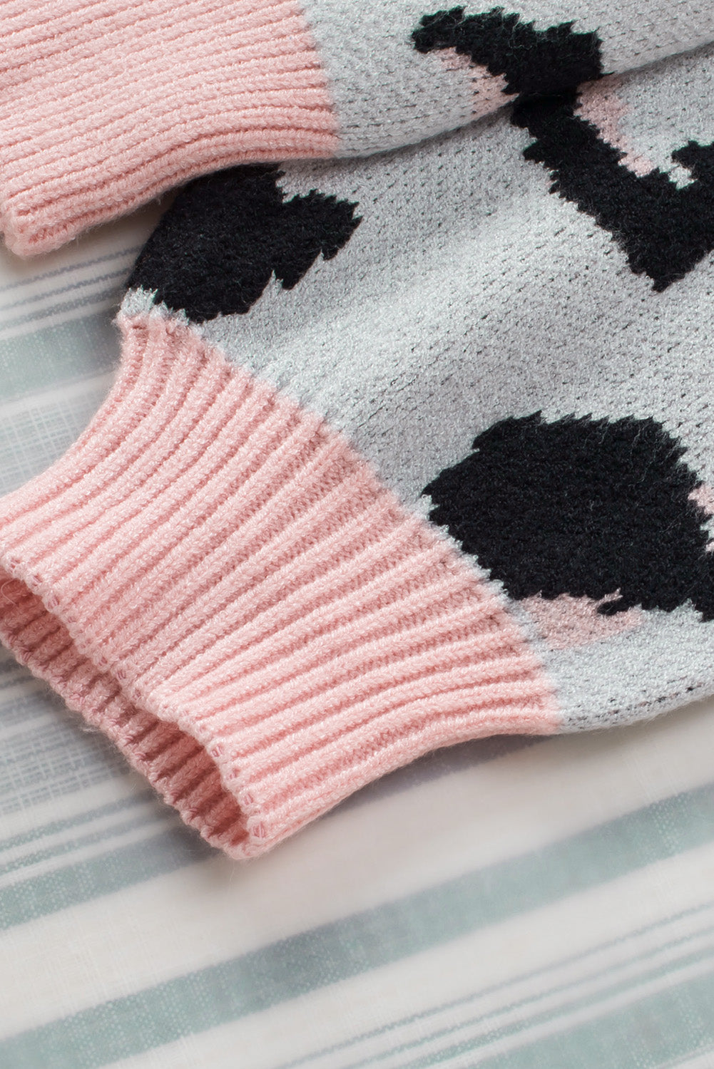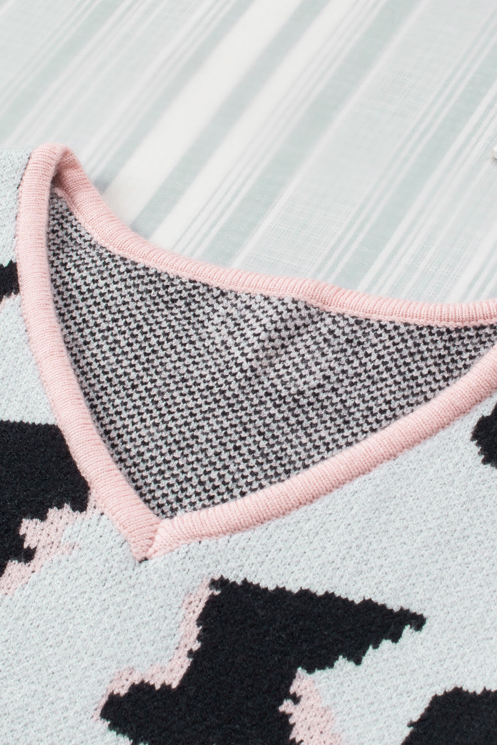 - Long sleeve leopard sweater has a v-neck with contrast trim