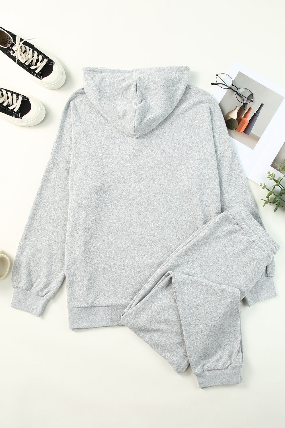 Gray Hooded Drawstring High Waist Two Piece Loungewear