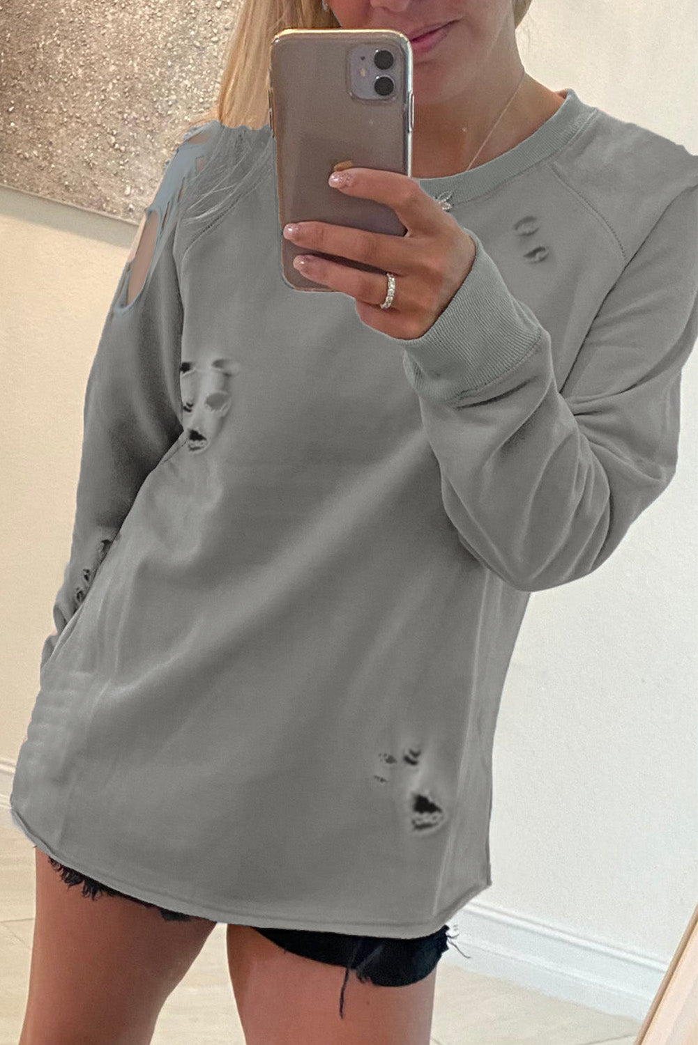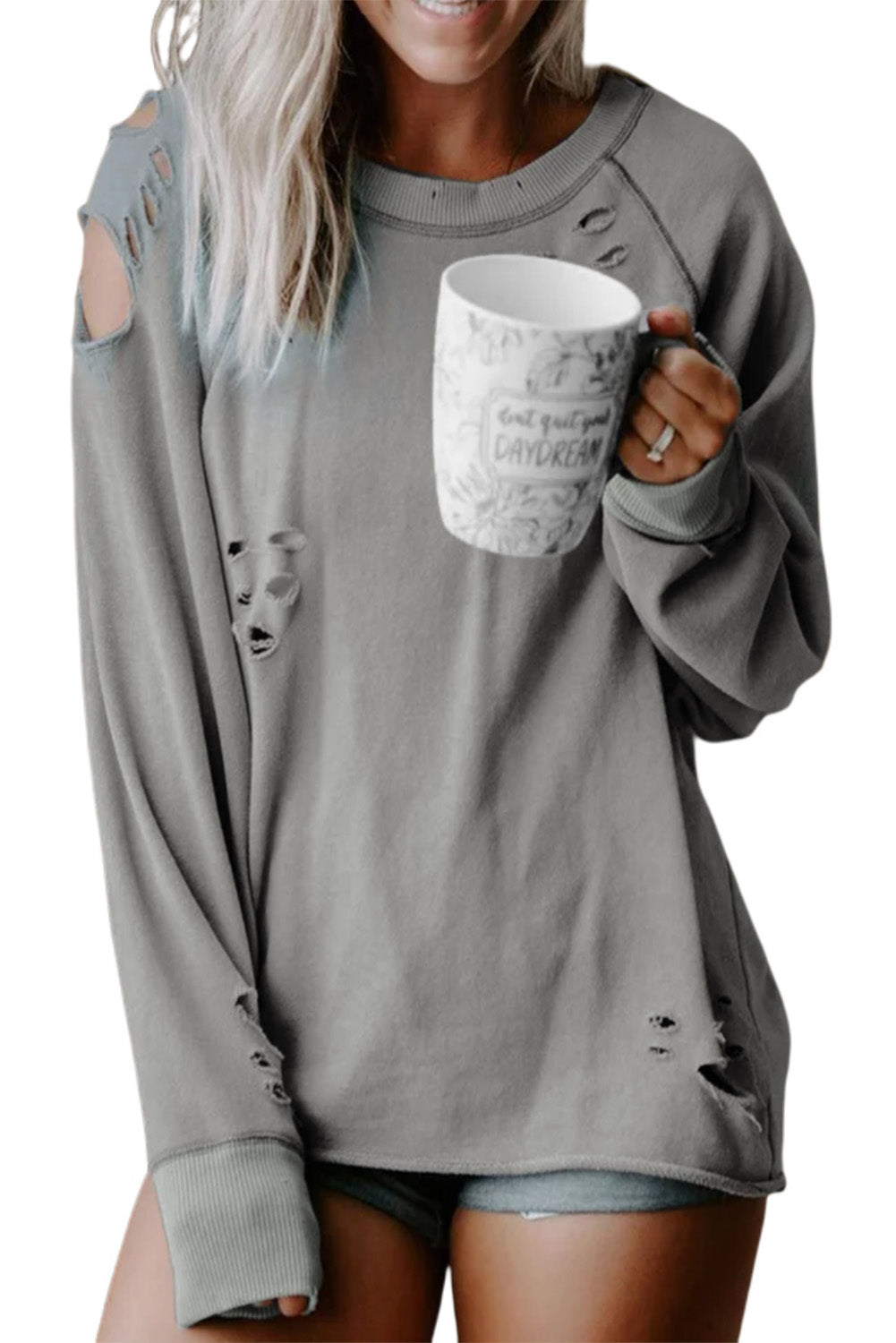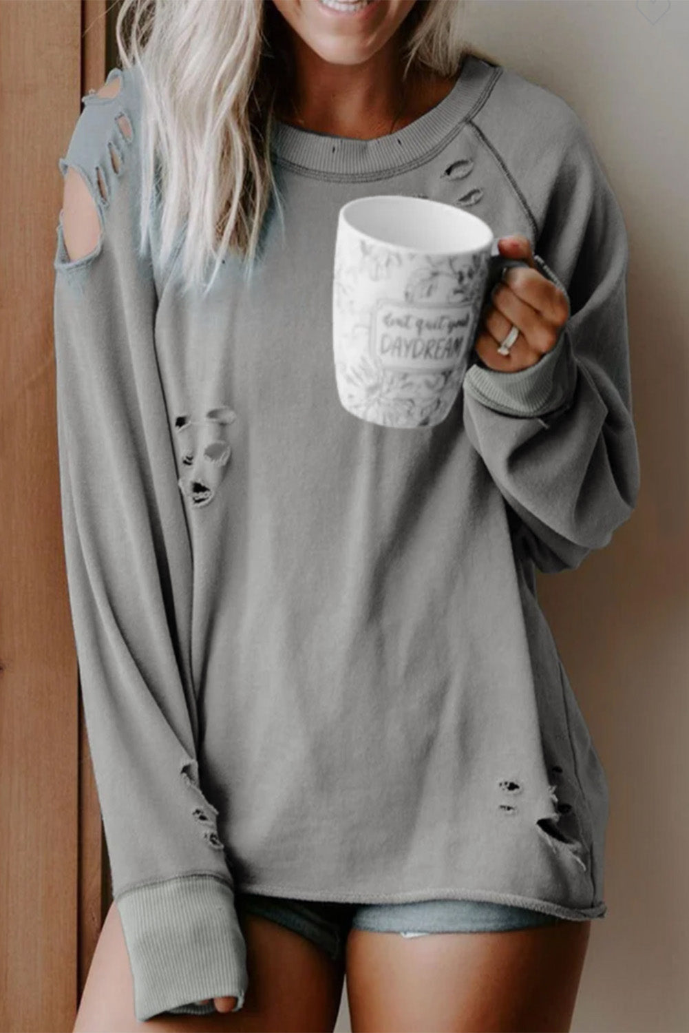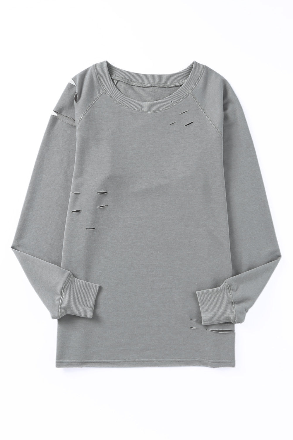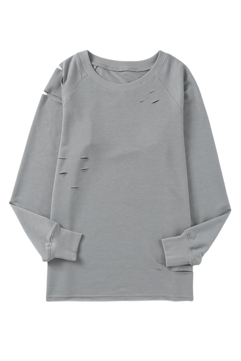 - Features vintage distressed design, ribbed trim along neckline and cuffs