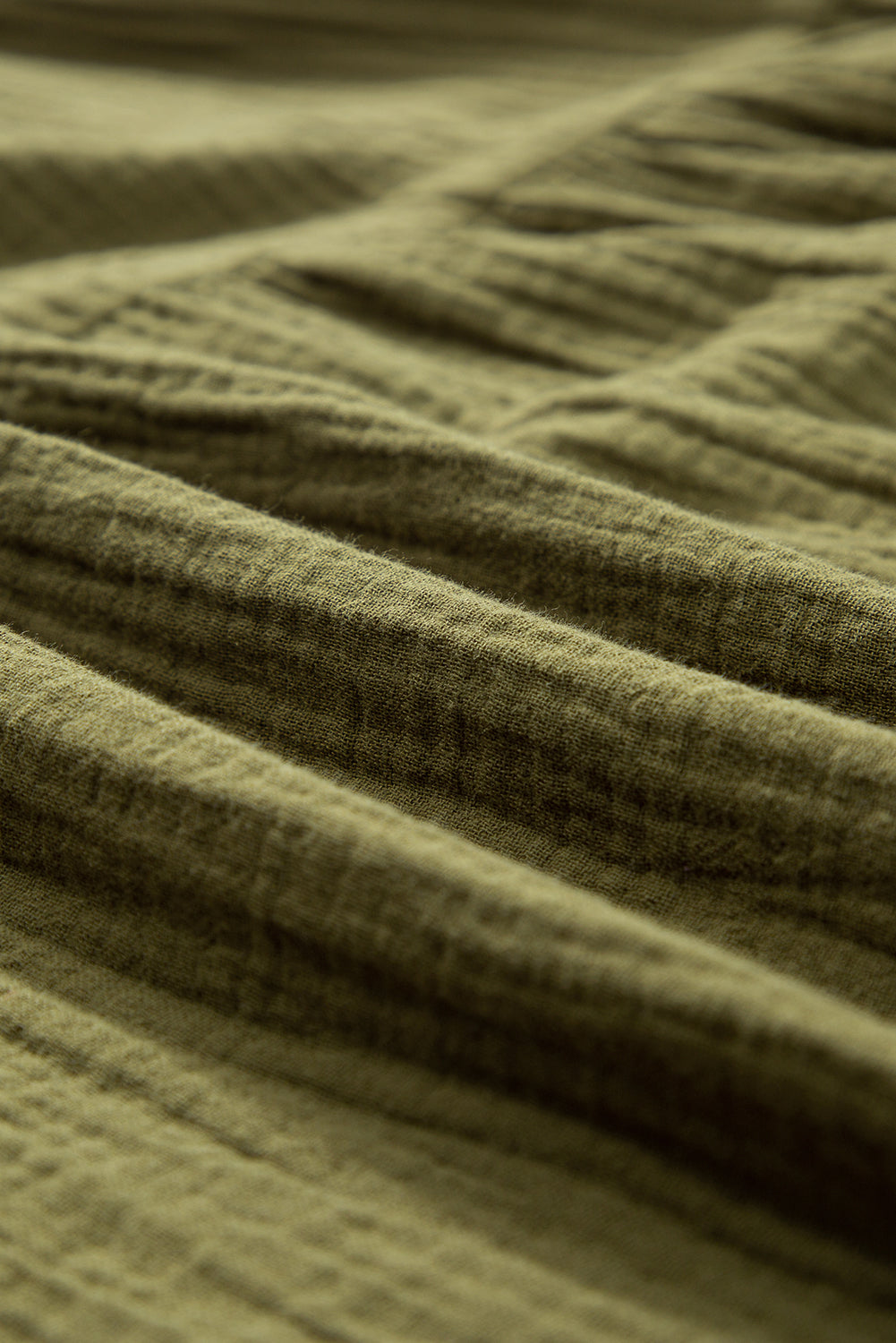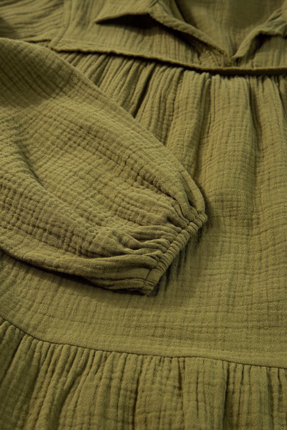 Green Frayed Trim Split Neck Puff Sleeve Flared Dress
