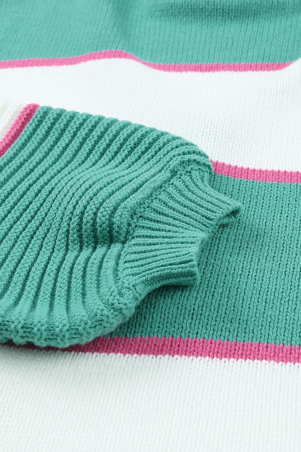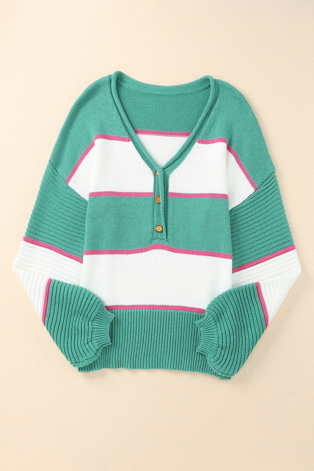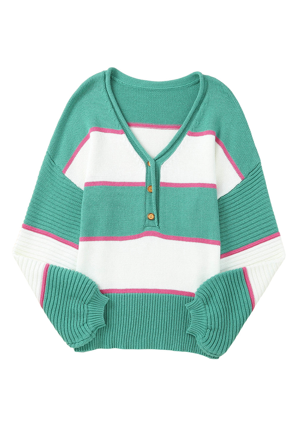 Green Striped Color Block Knitted Buttoned V Neck Sweater