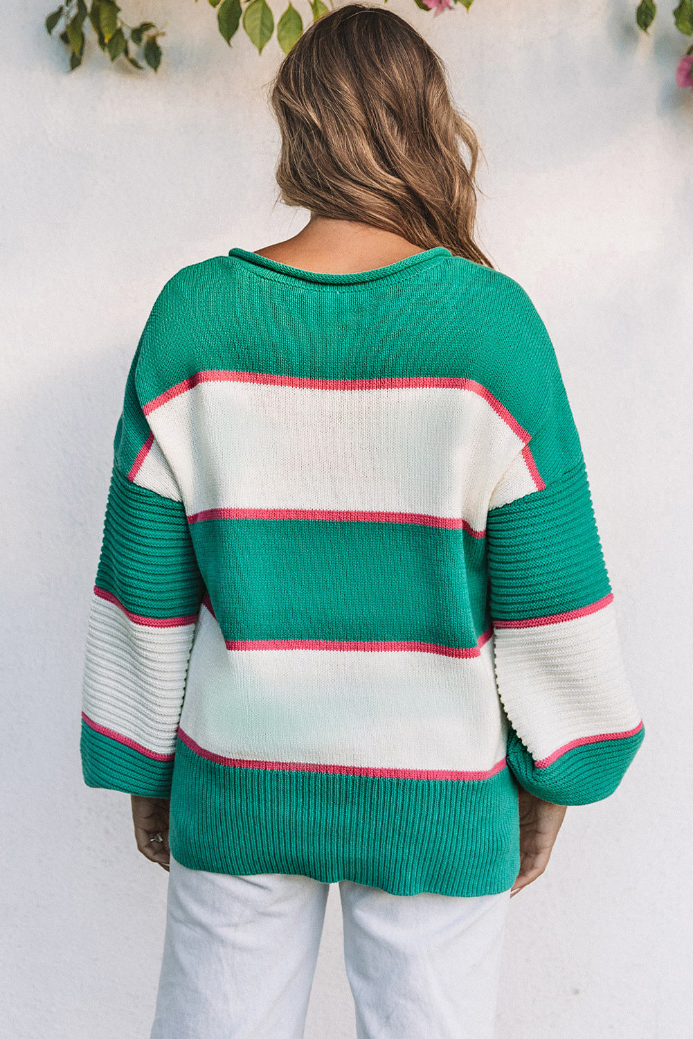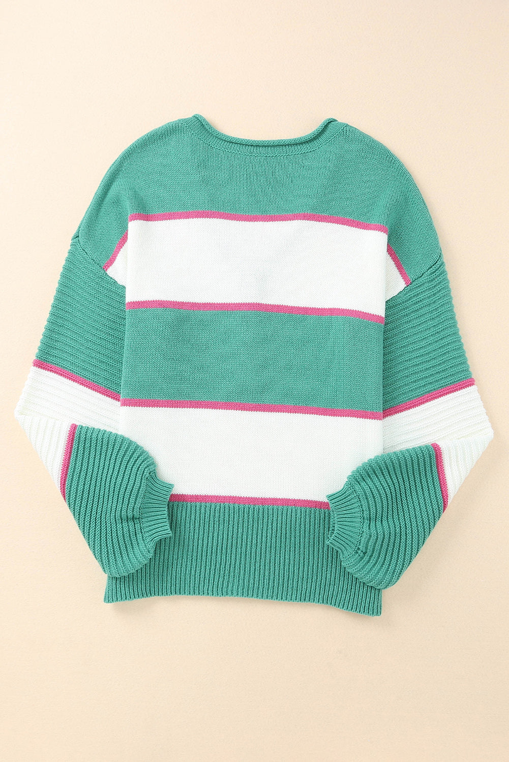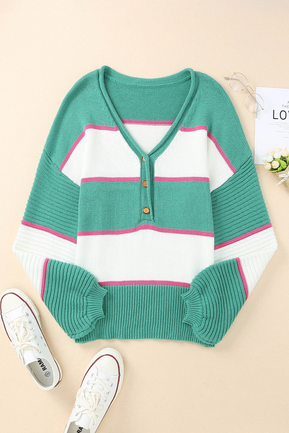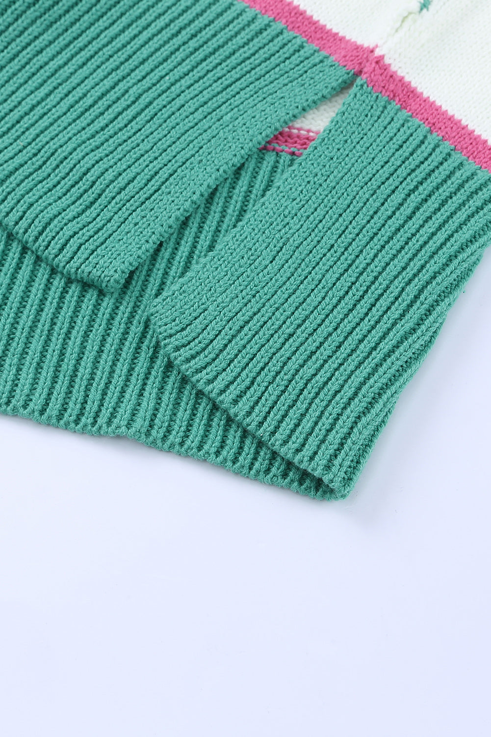 Green Striped Color Block Knitted Buttoned V Neck Sweater