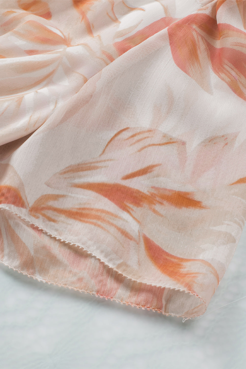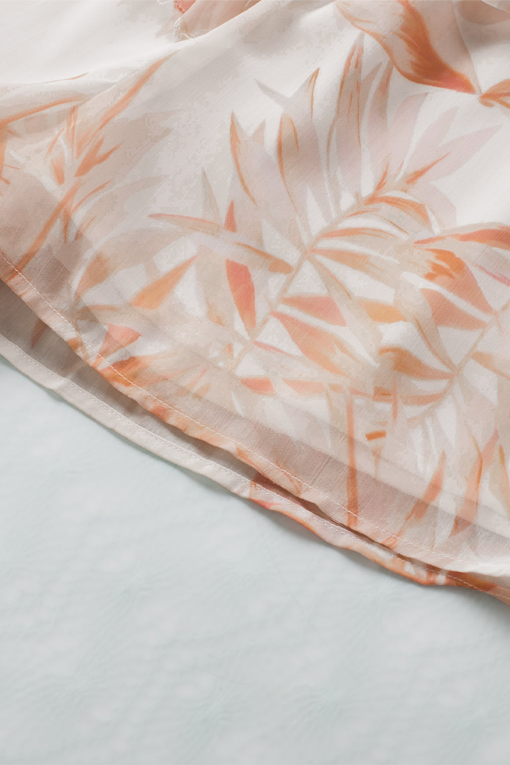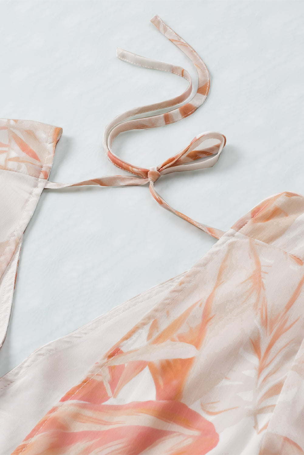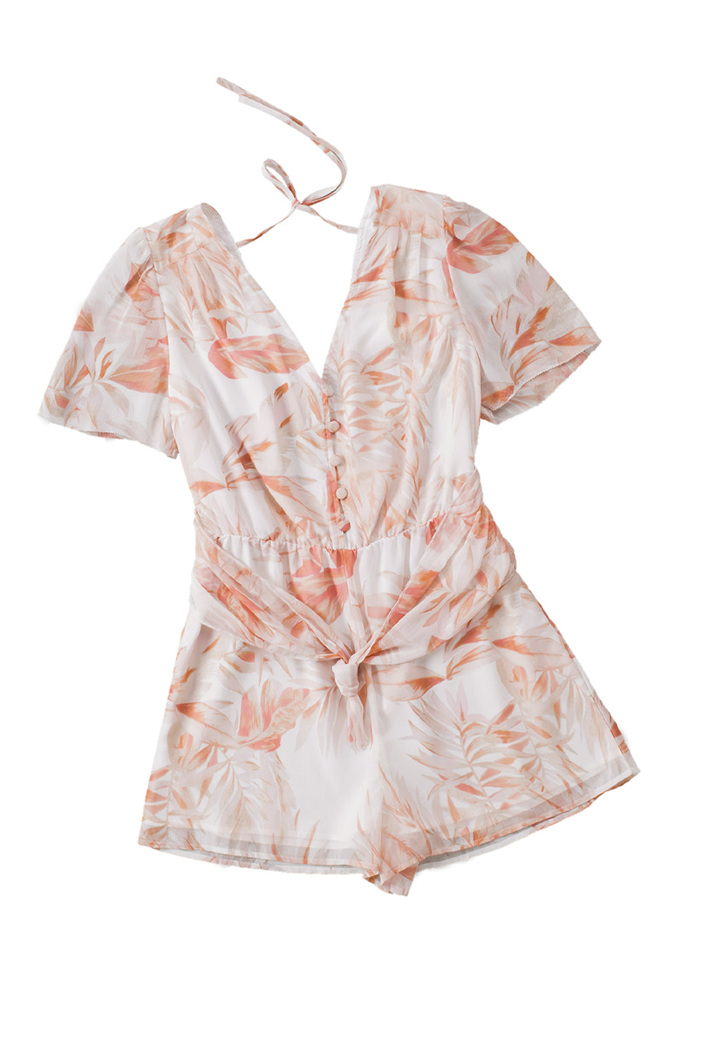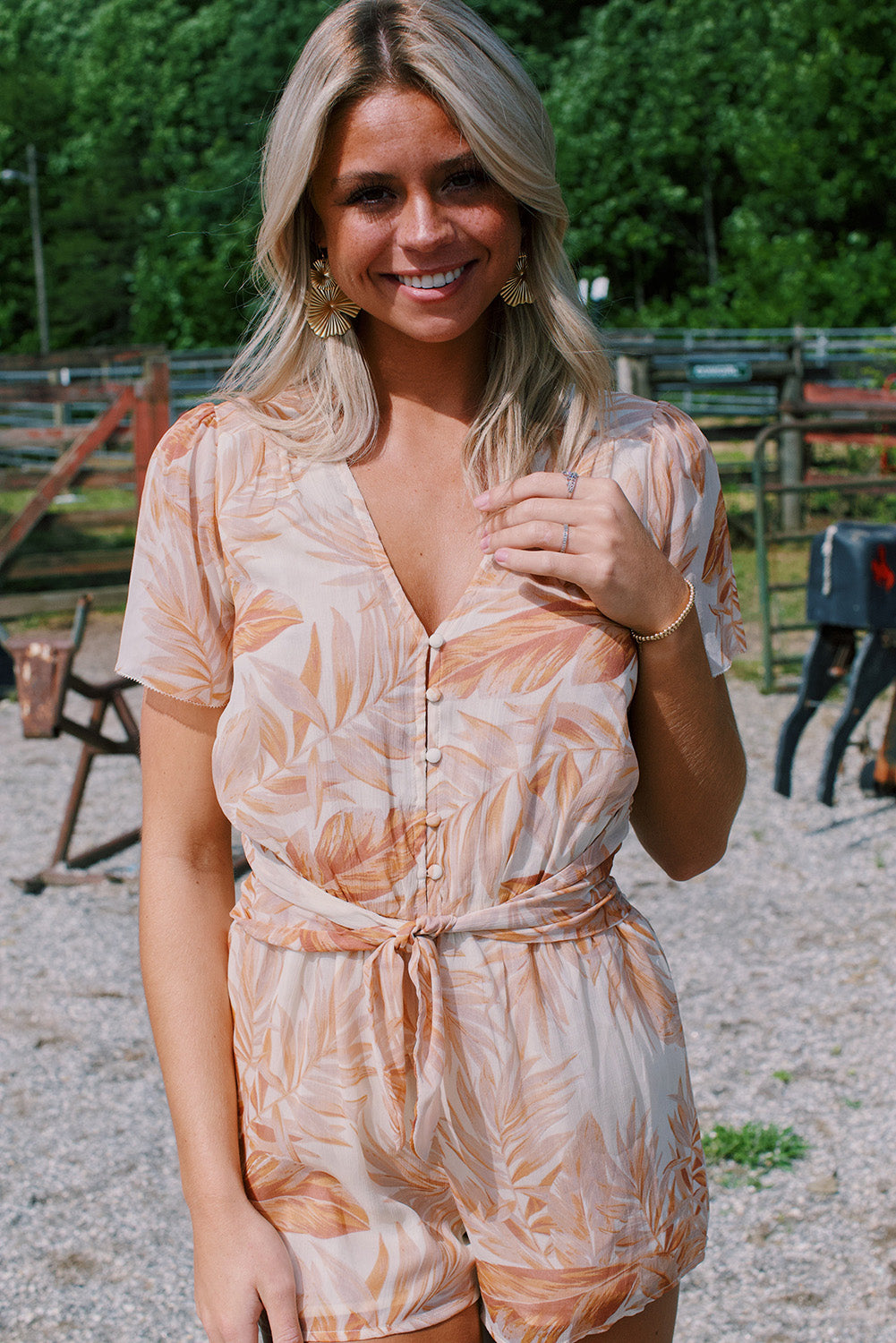 Khaki Tropical Leaf Print Button Belted Chiffon Romper