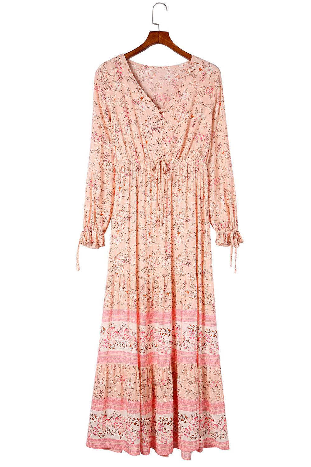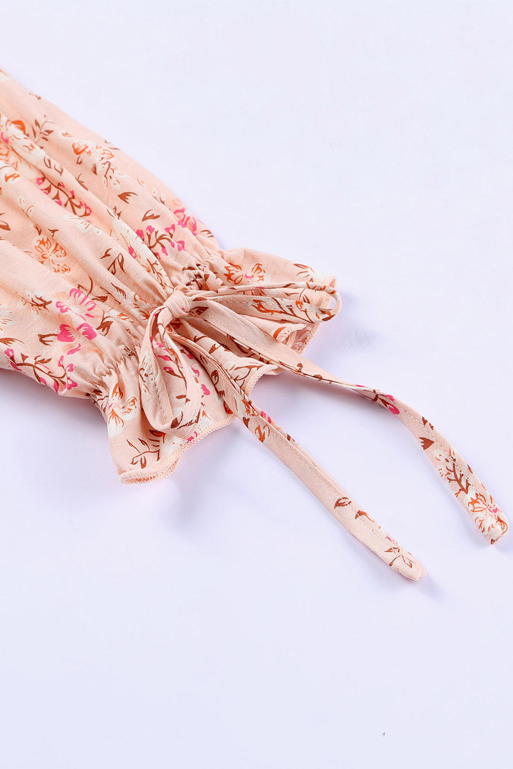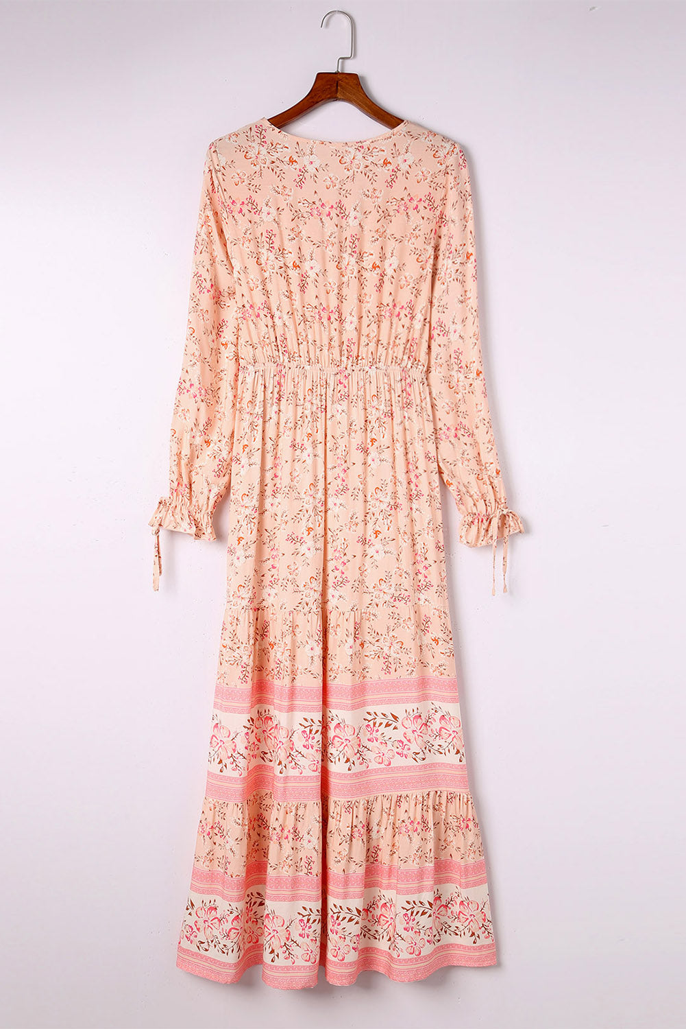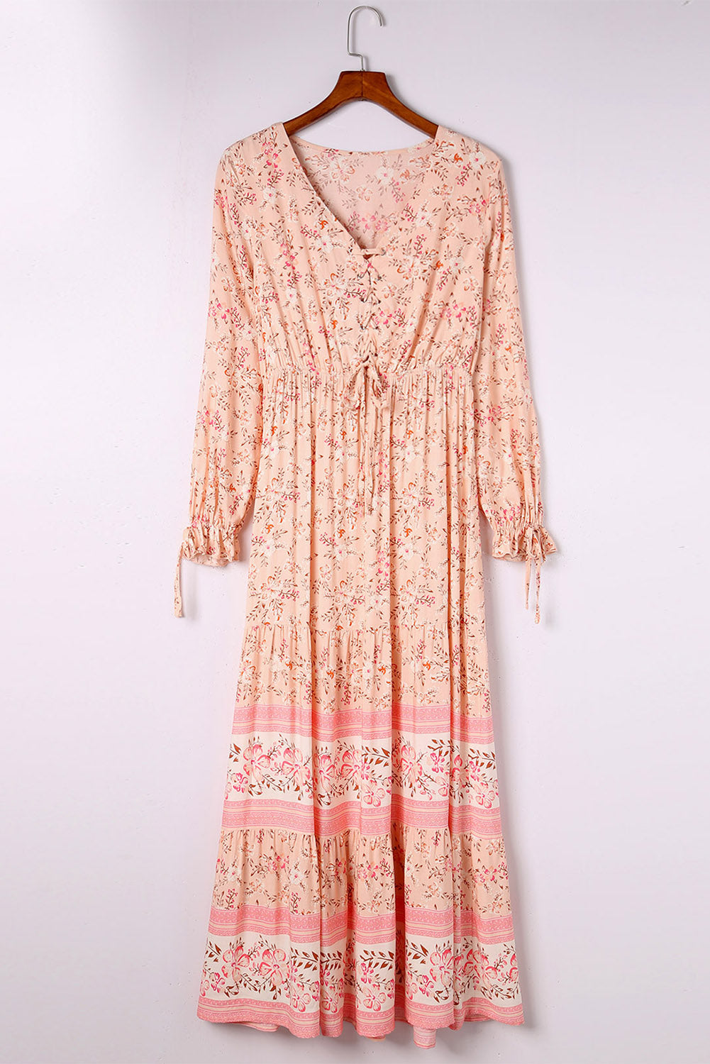 Orange Drawstring Lace-up V Neck Long Sleeve Floral Maxi Dress