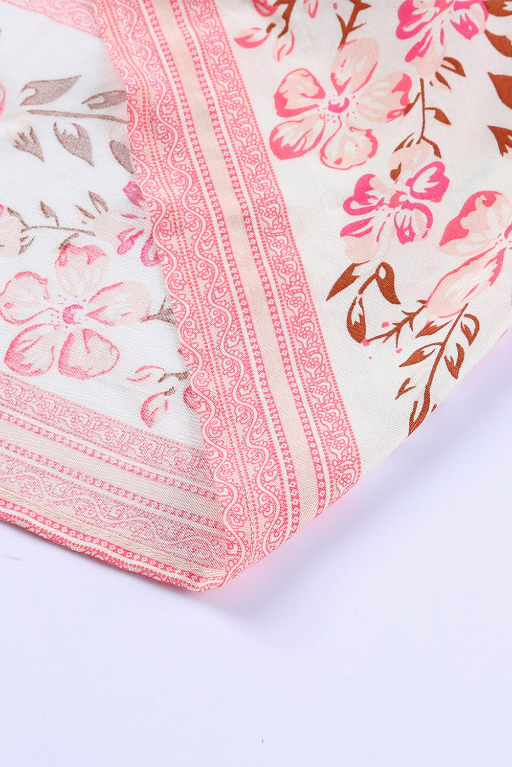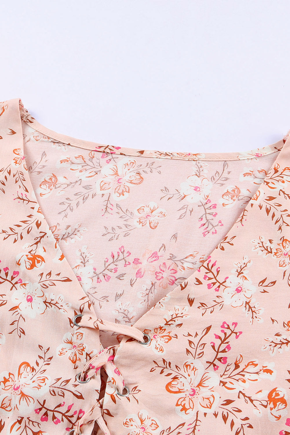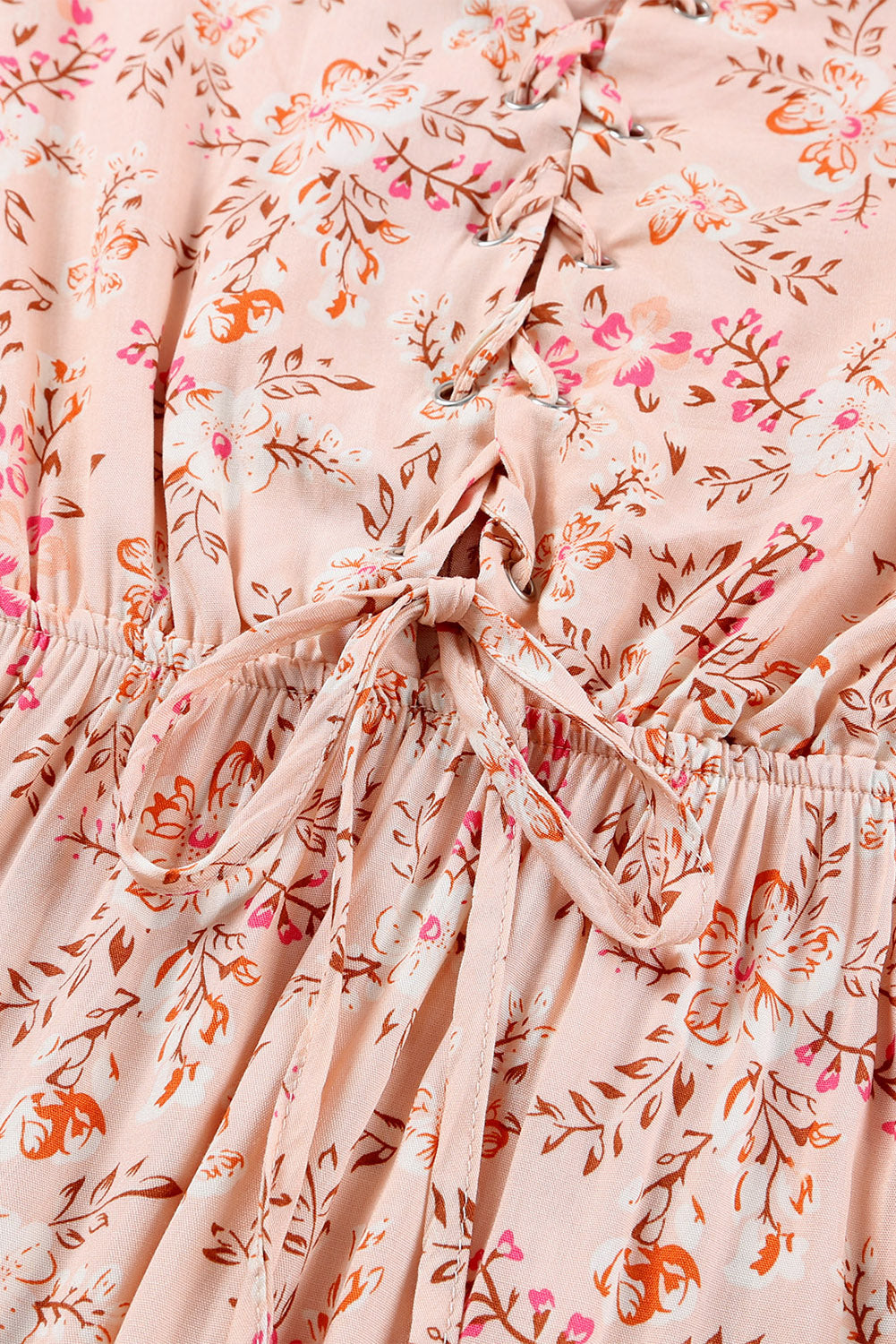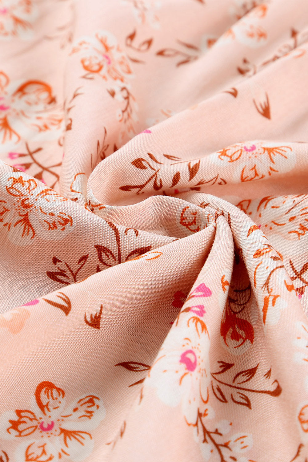 Orange Drawstring Lace-up V Neck Long Sleeve Floral Maxi Dress