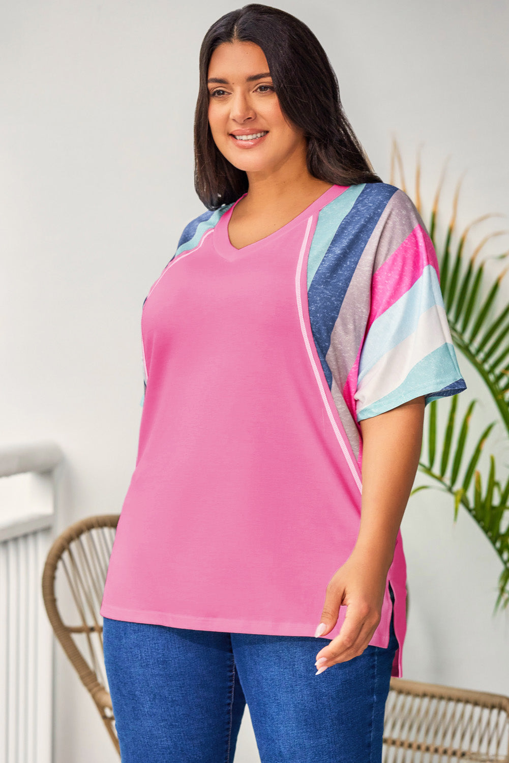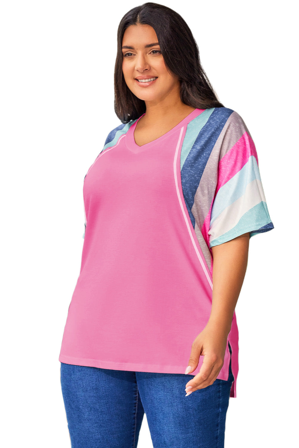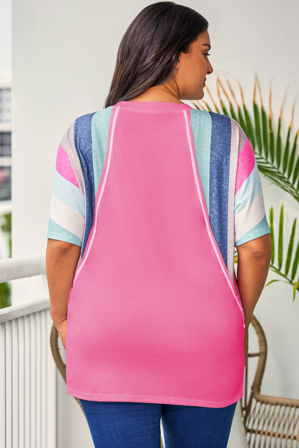 Pink Striped Patchwork Short Sleeve V Neck Plus Size T-Shirt