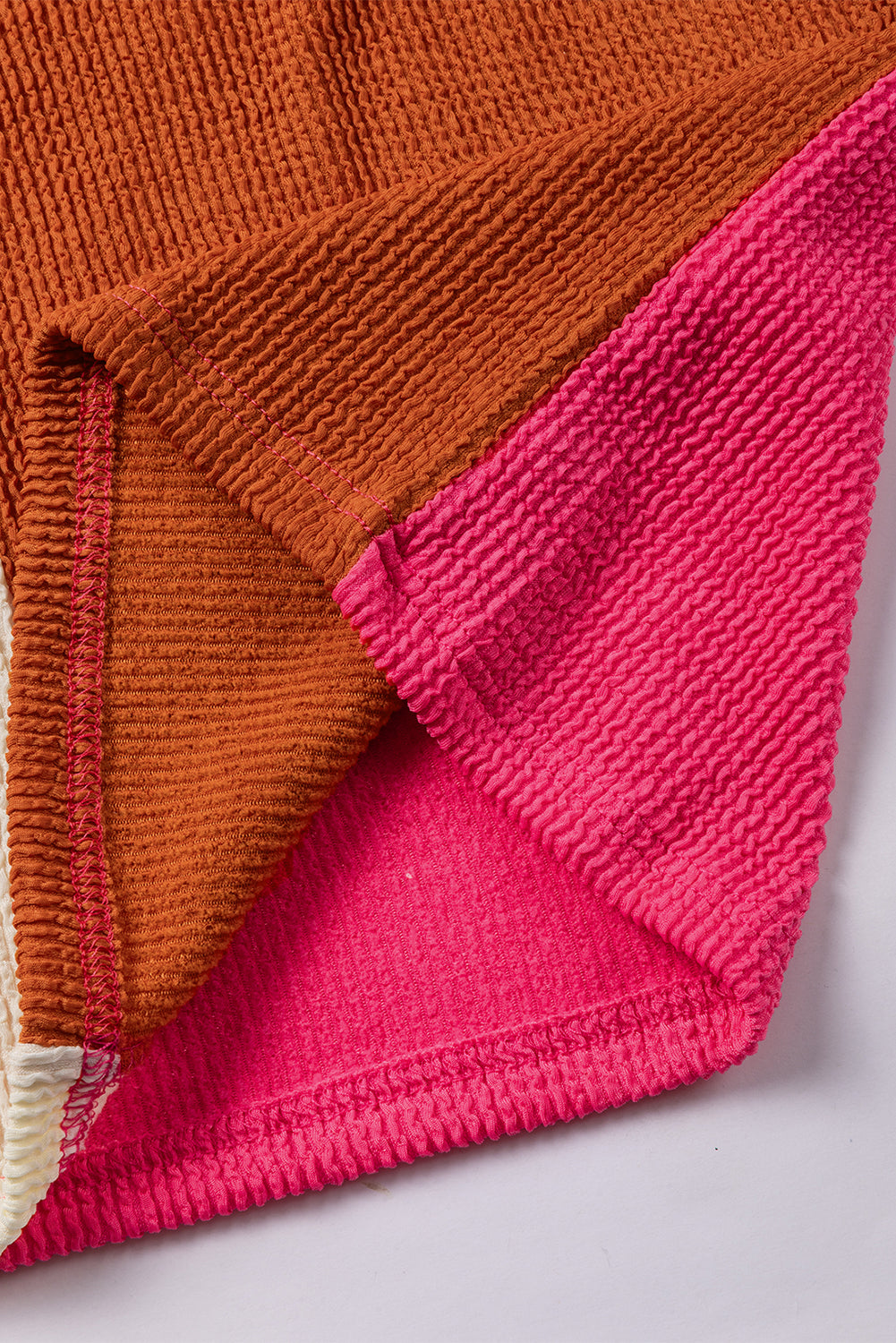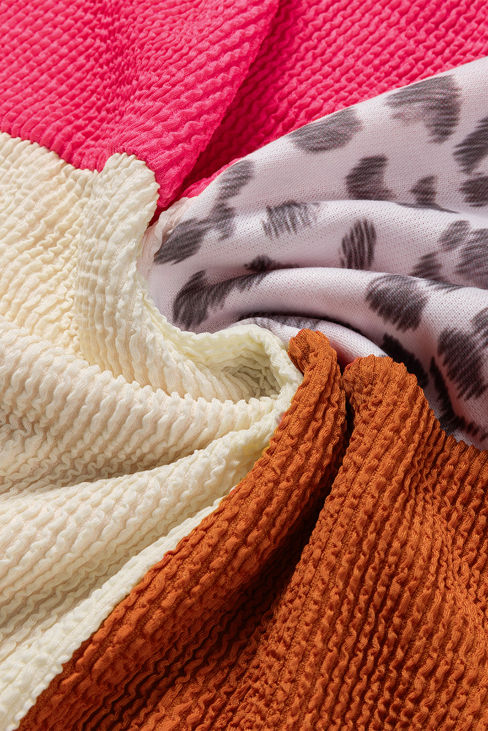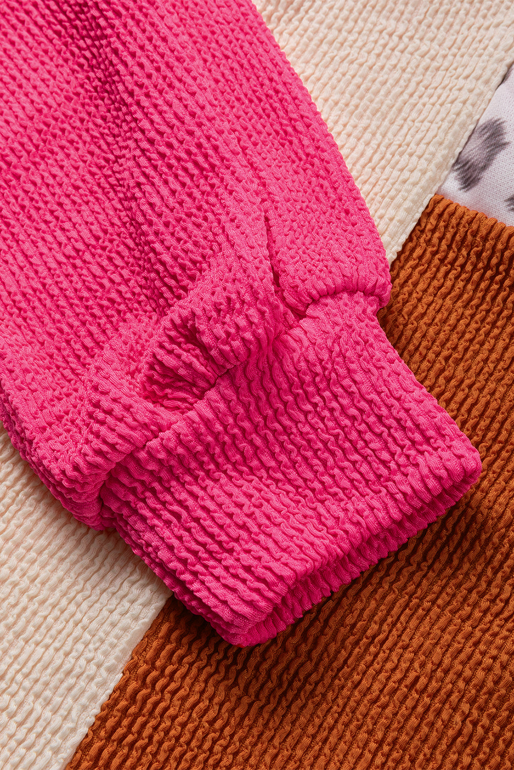 Rose Leopard Patchwork Color Block Ribbed Long Sleeve Top