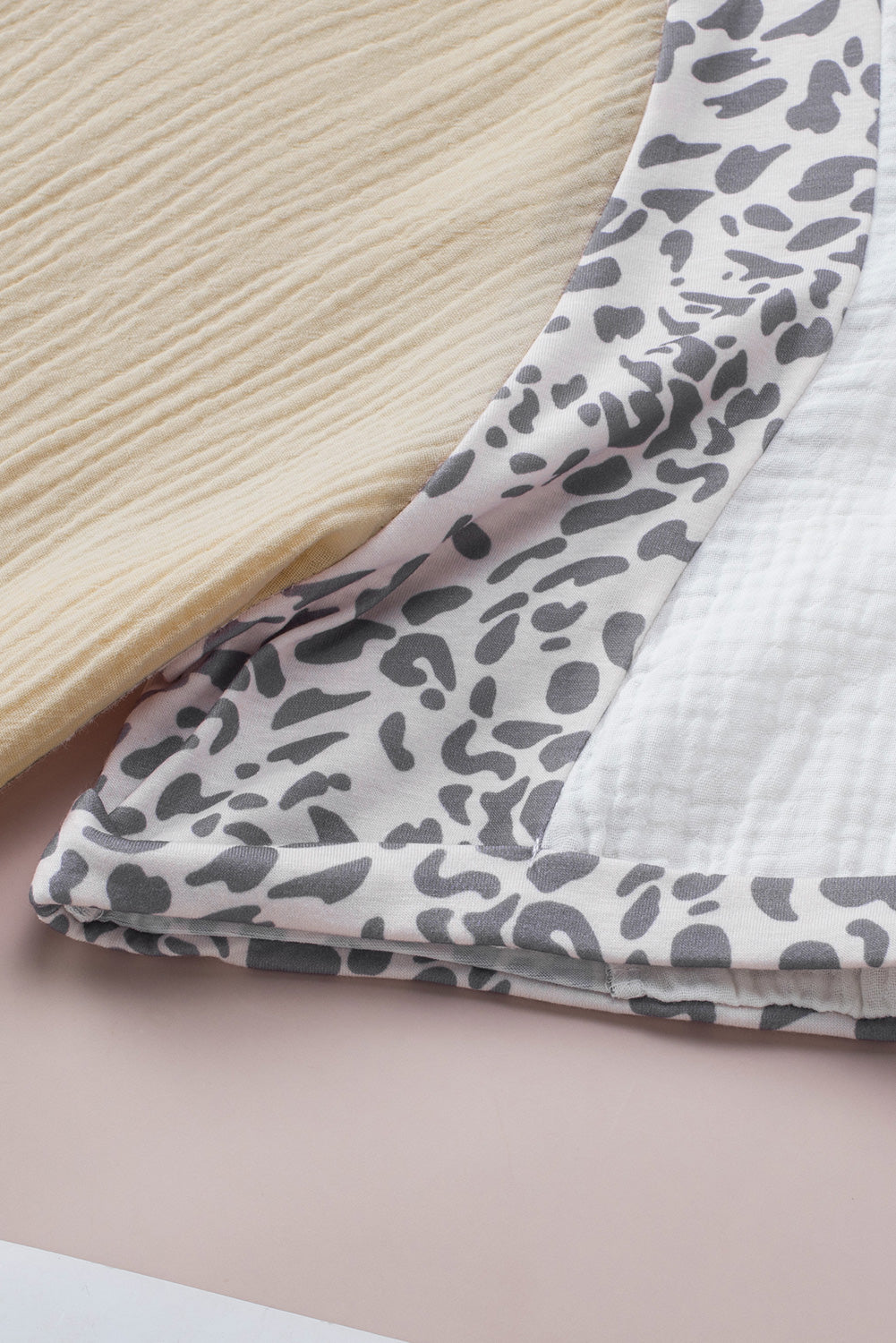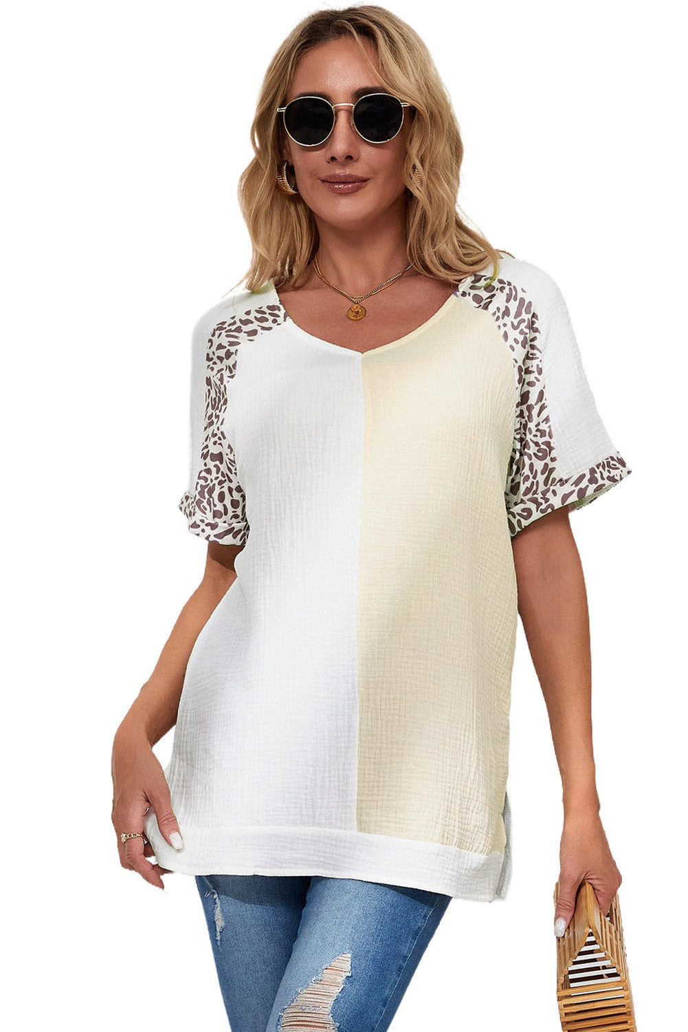 White Distressed Color Patchwork Leopard Trim Blouse