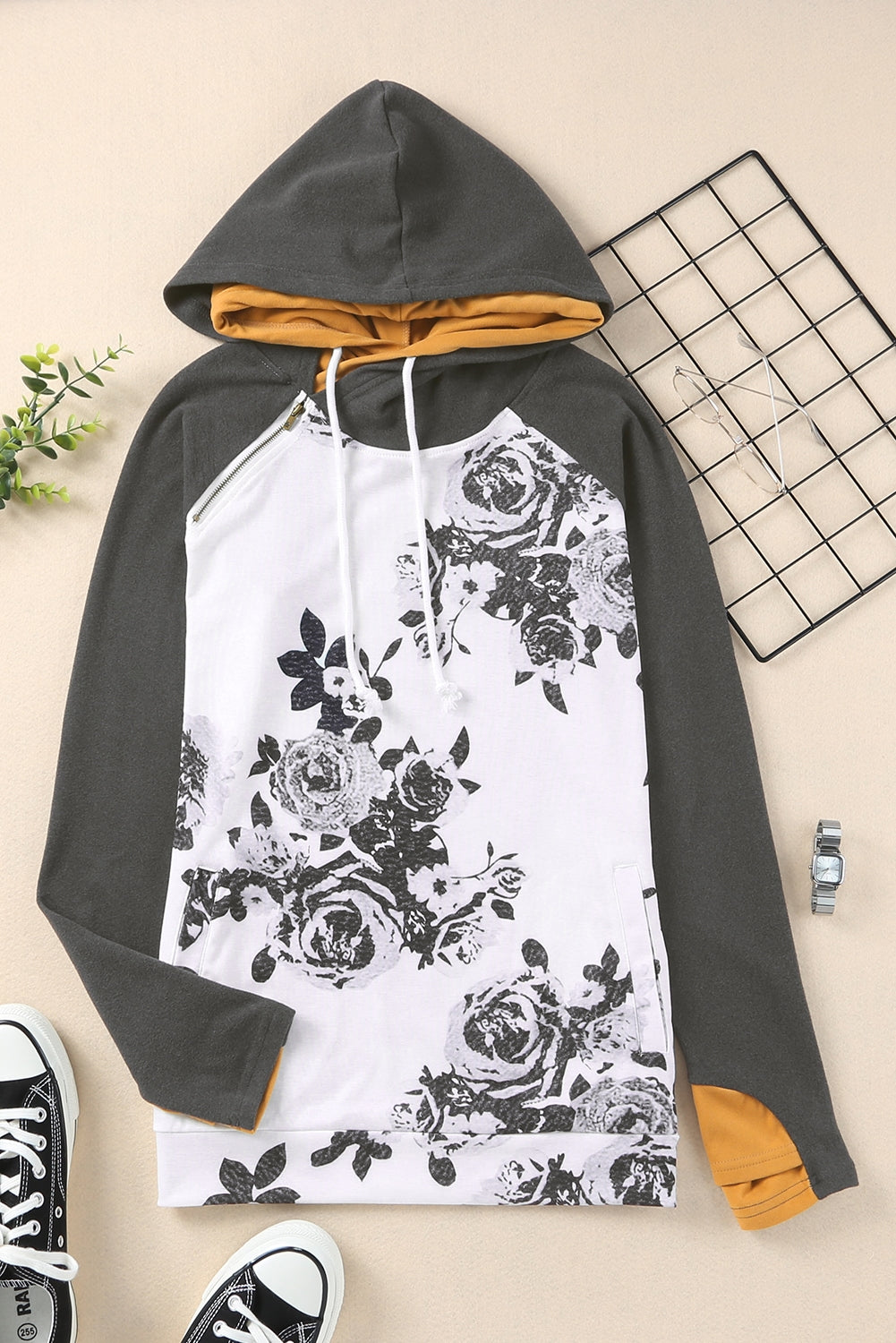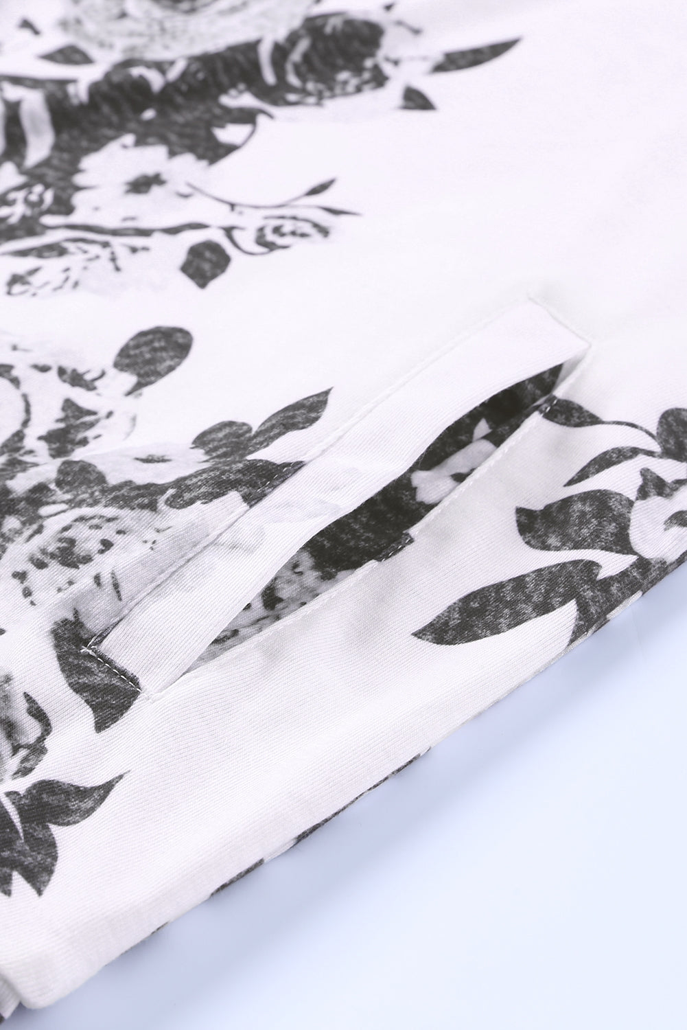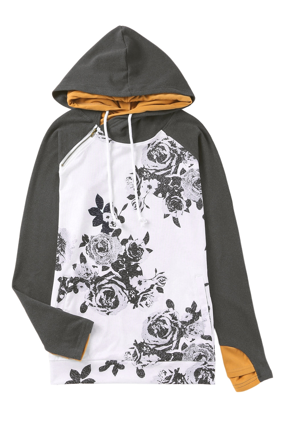 White Floral Pattern Raglan Sleeves Double Hood Sweatshirt
