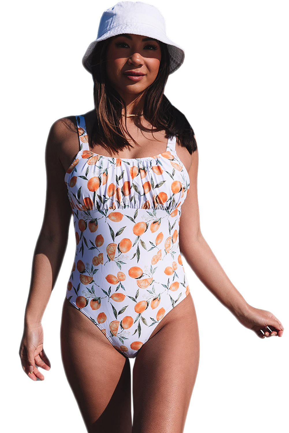 White Fruit Pattern Print Ruched One-piece Swimsuit